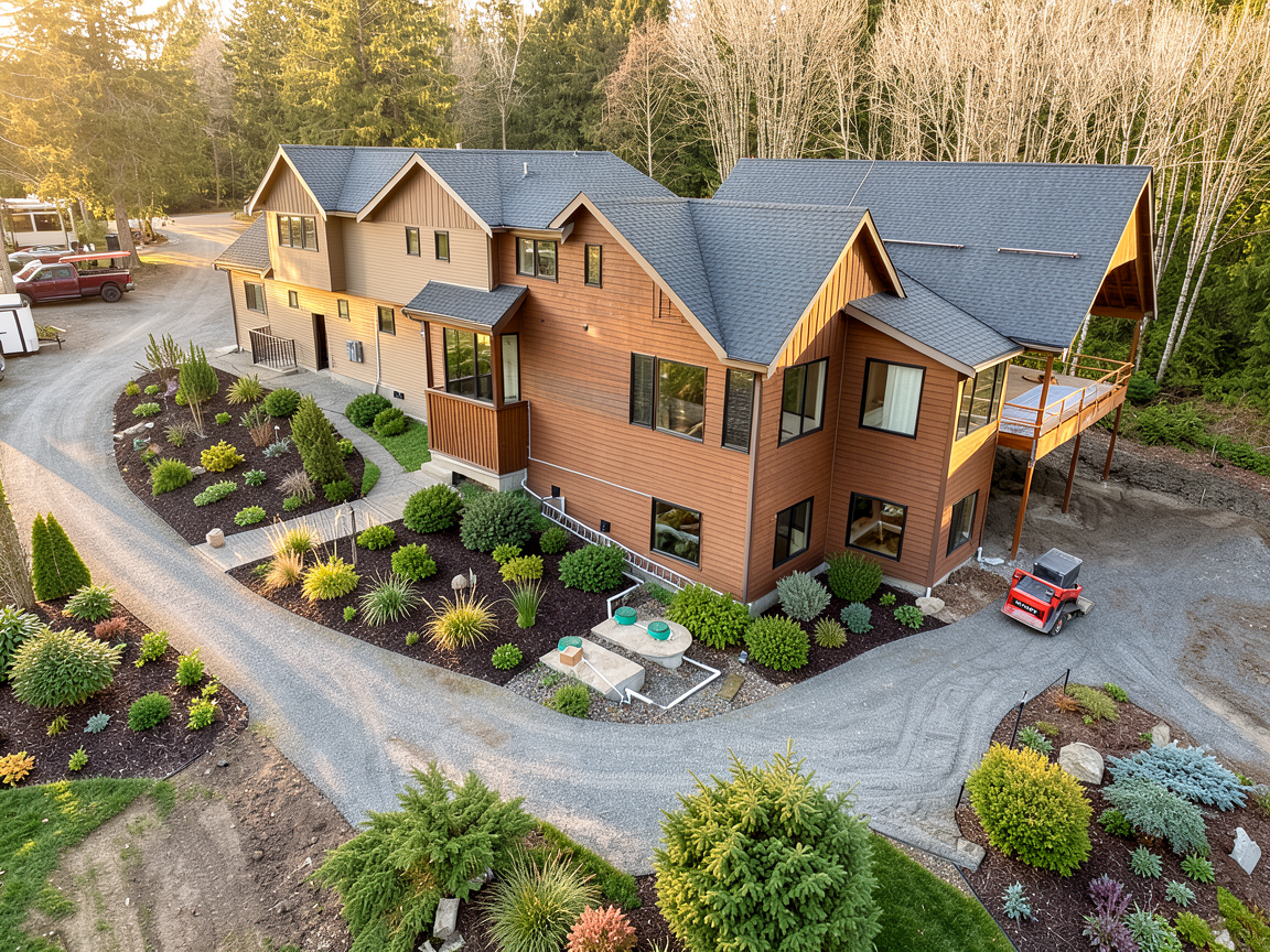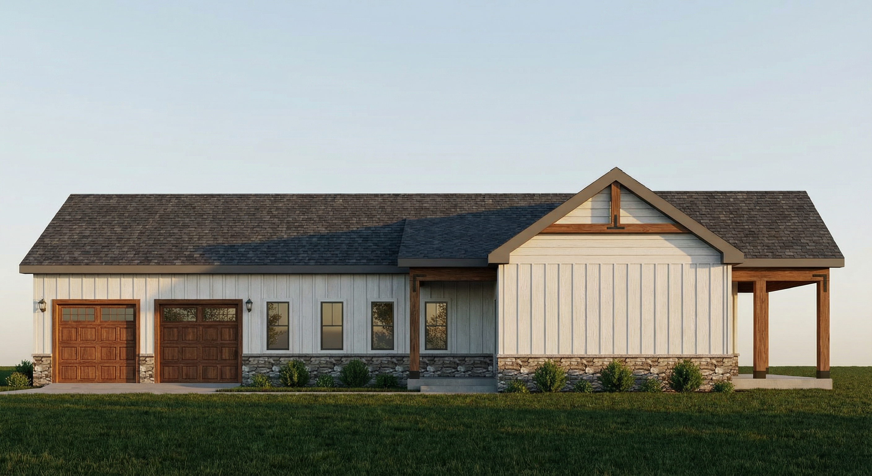 finish the house with dark beige siding stonework and paneling add simple landscaping finish the deck keep in mind that this is a side elevation not the front