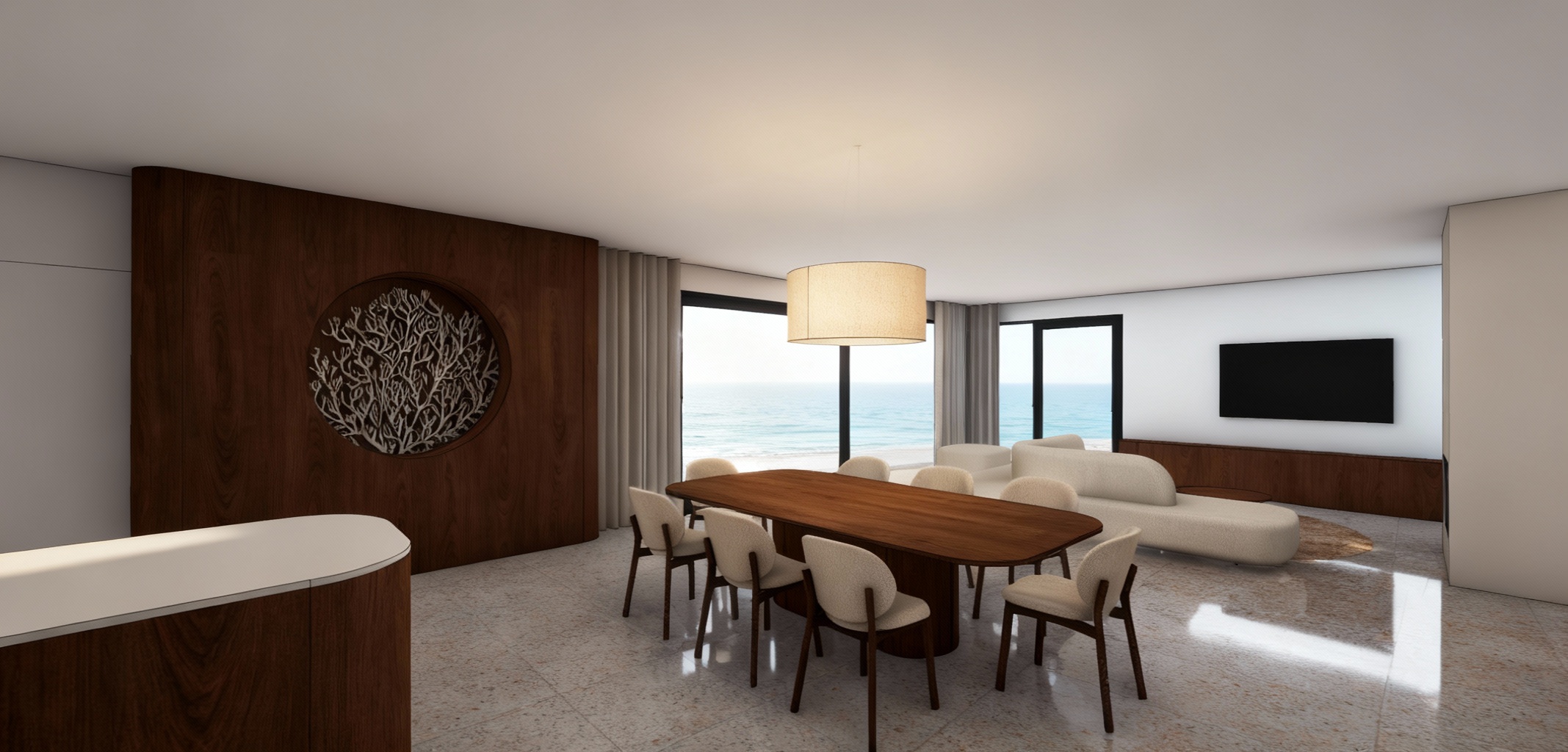 landscape with sea behind the large window light glossy grey tan terrazzo tiles floor wall nut wood furniture soft creamy tones of fabrics