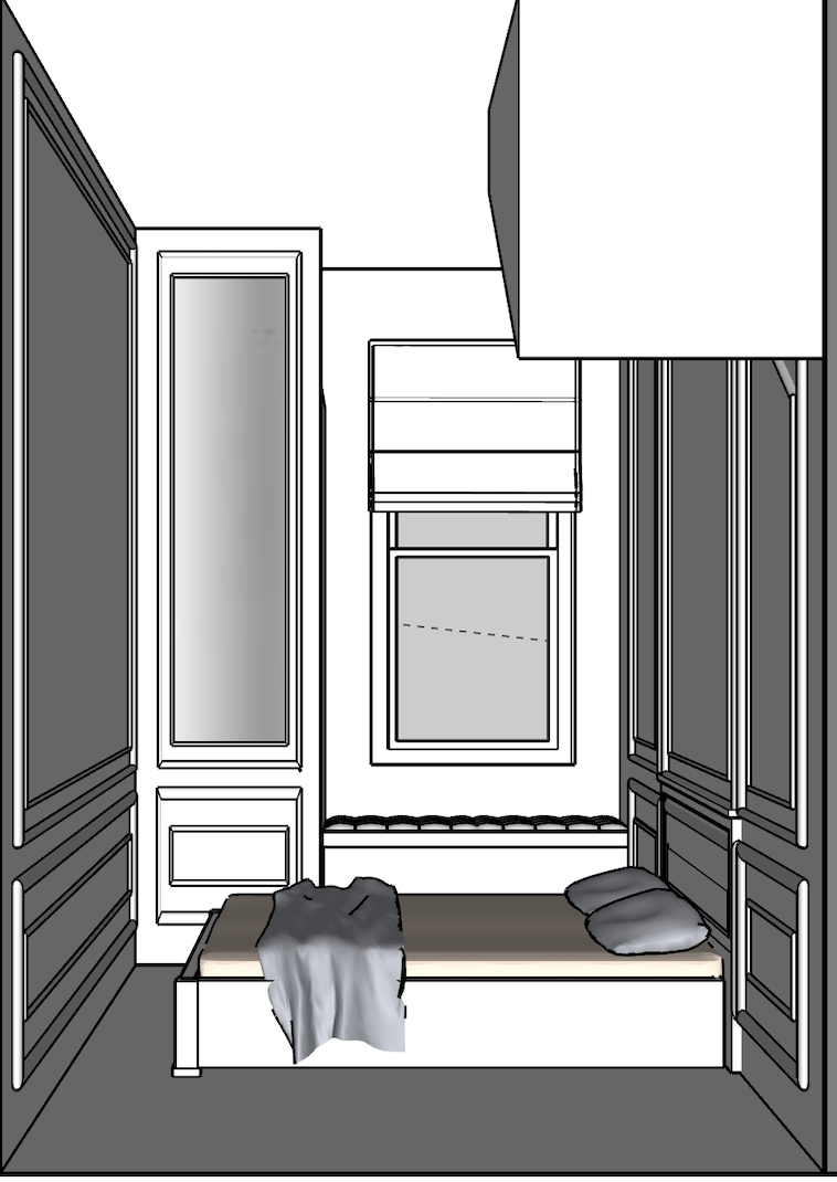 front view of neoclassical bedroom with window at the ends and neoclassical mouldings in white architecture