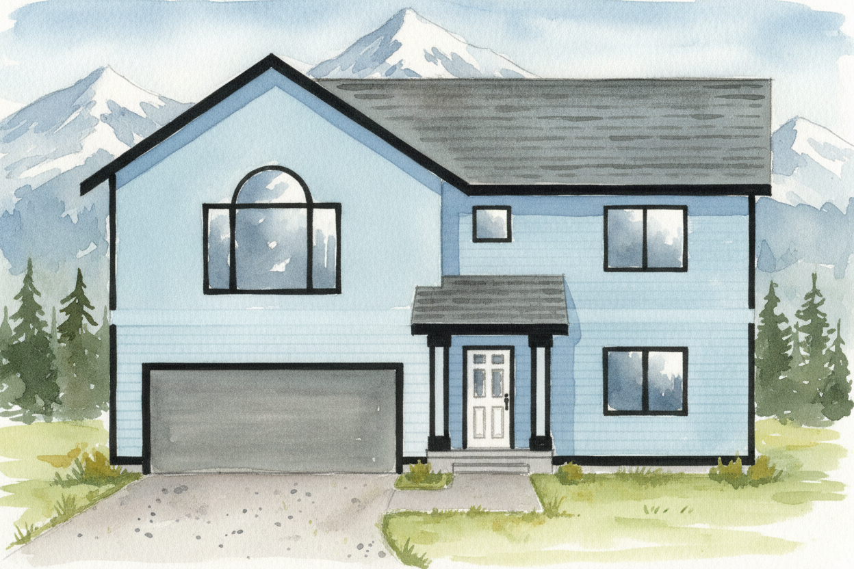 watercolor render of modern home with dark grey paint and stone accents include trees and an alaska like environment in the background simple driveway and walkways in front of the home