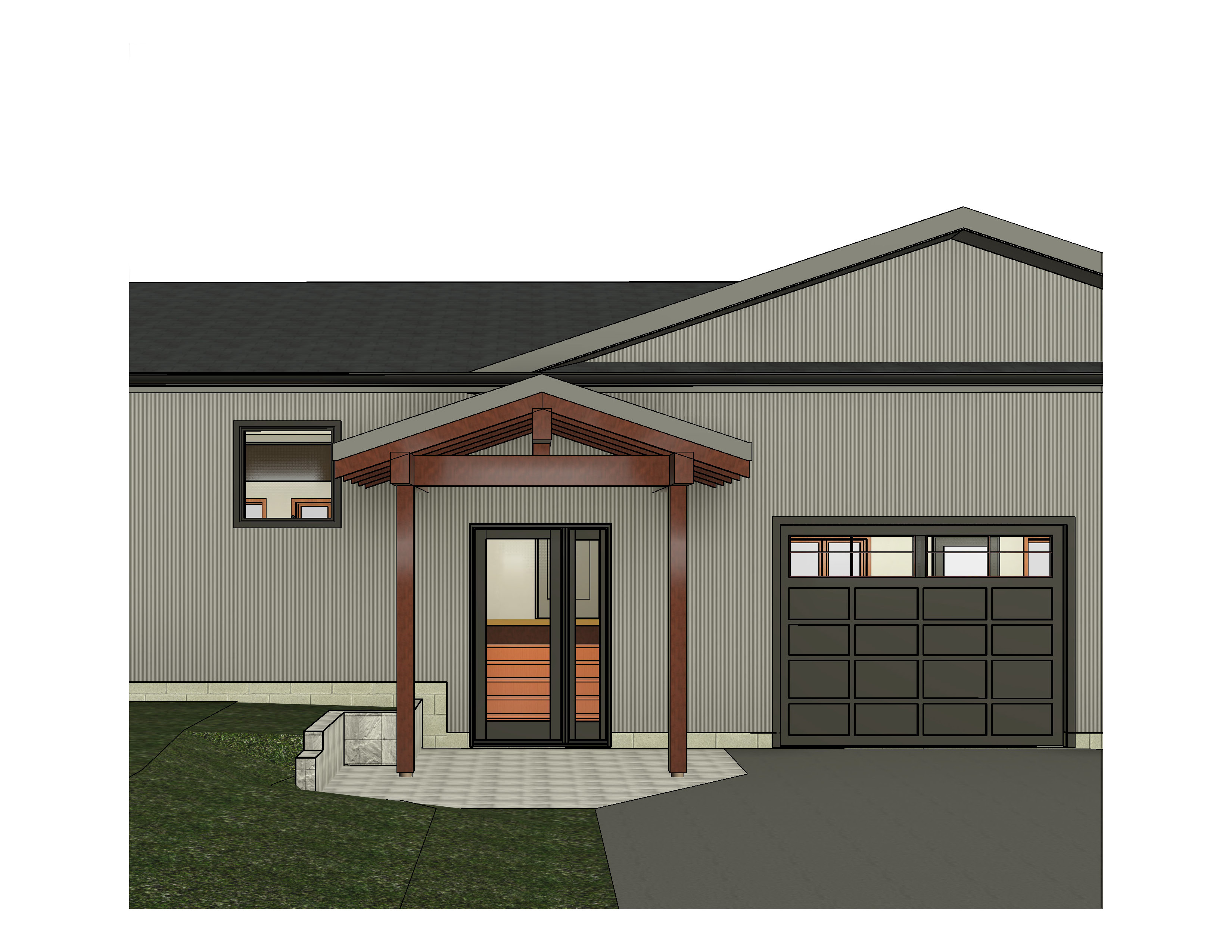 siding to be vertical charcoal color no window in front door but keep the sidelight
