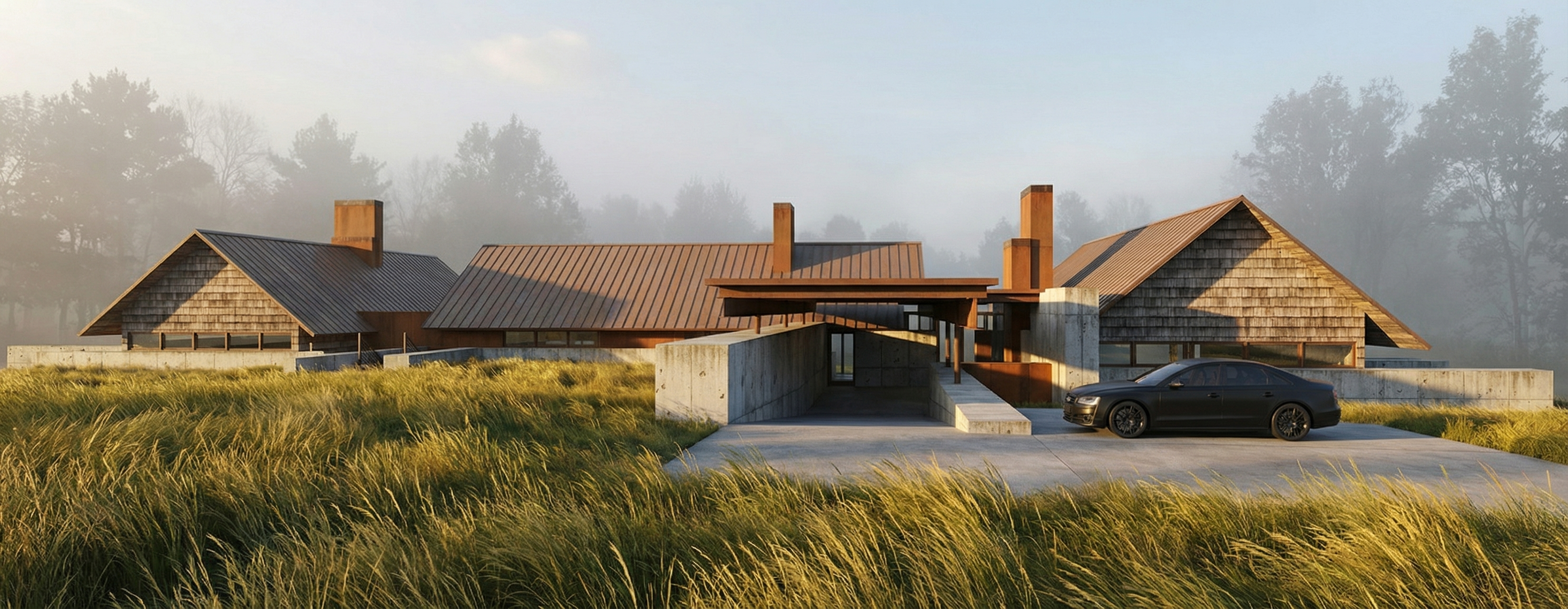 photorealistic exterior render keep all existing geometry exactly as modelled in the sketchup file the central ground level area must remain a full open through void open on both sides with no walls added or filled in grass to be minimal neat and tidy only where already present no grass added to driveways or hardscape areas glass balustrades remain exactly as modelled with straight clean edges no distortion or extra panels do not add remove or alter any architectural elements