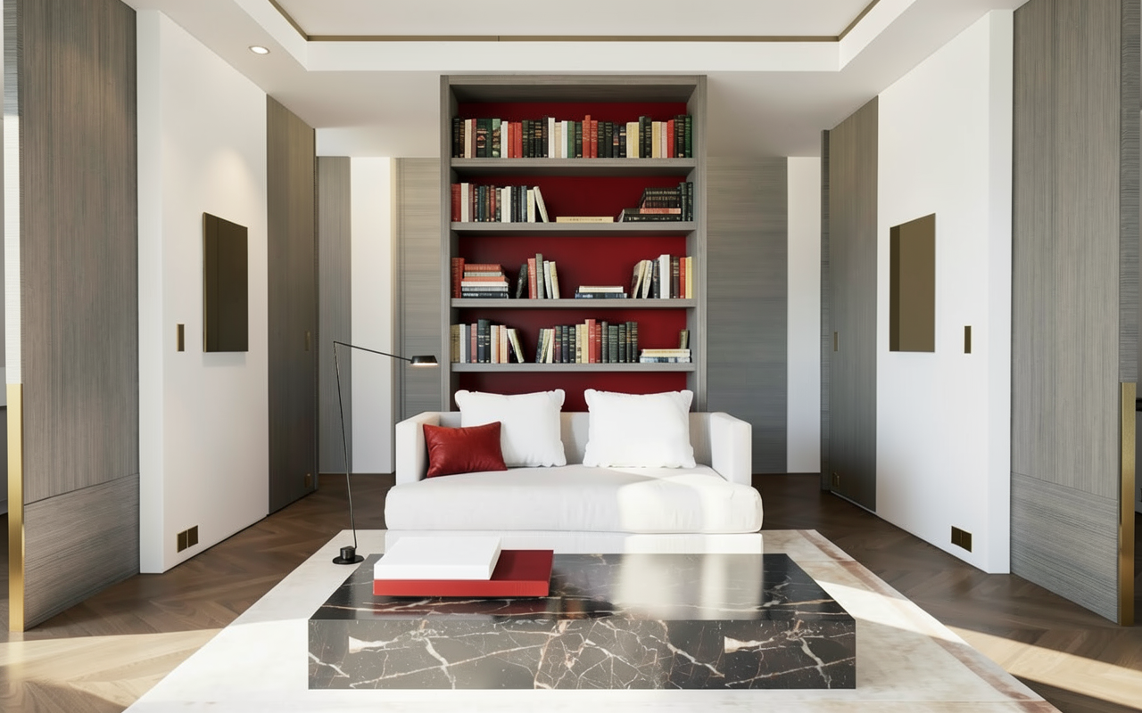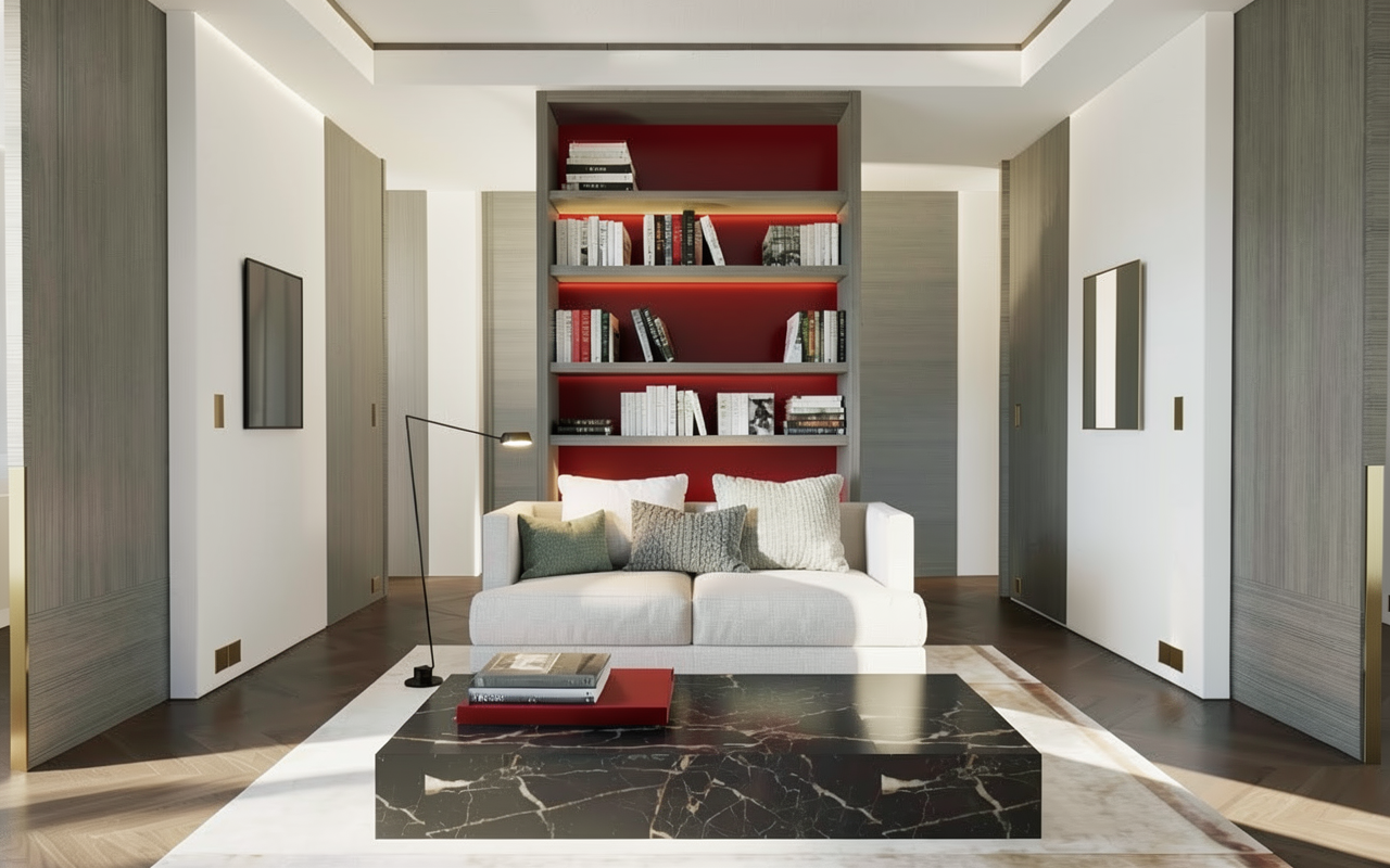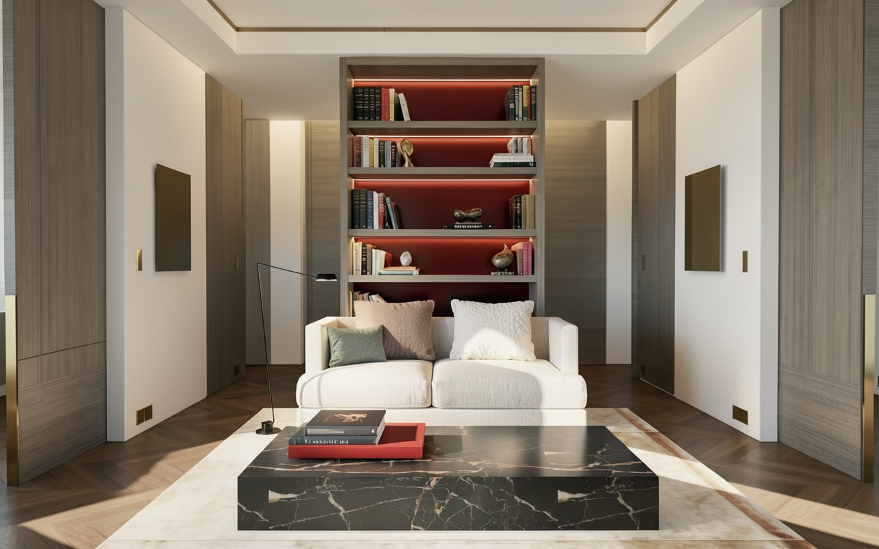 from top view of the living room additional light cove and spot down light on ceiling enhance the brightness of the space morning sun light from outside top bottom island cabinet with led strip display cabinet with some wine liquors a high chandelier crystal pendant light center above island table