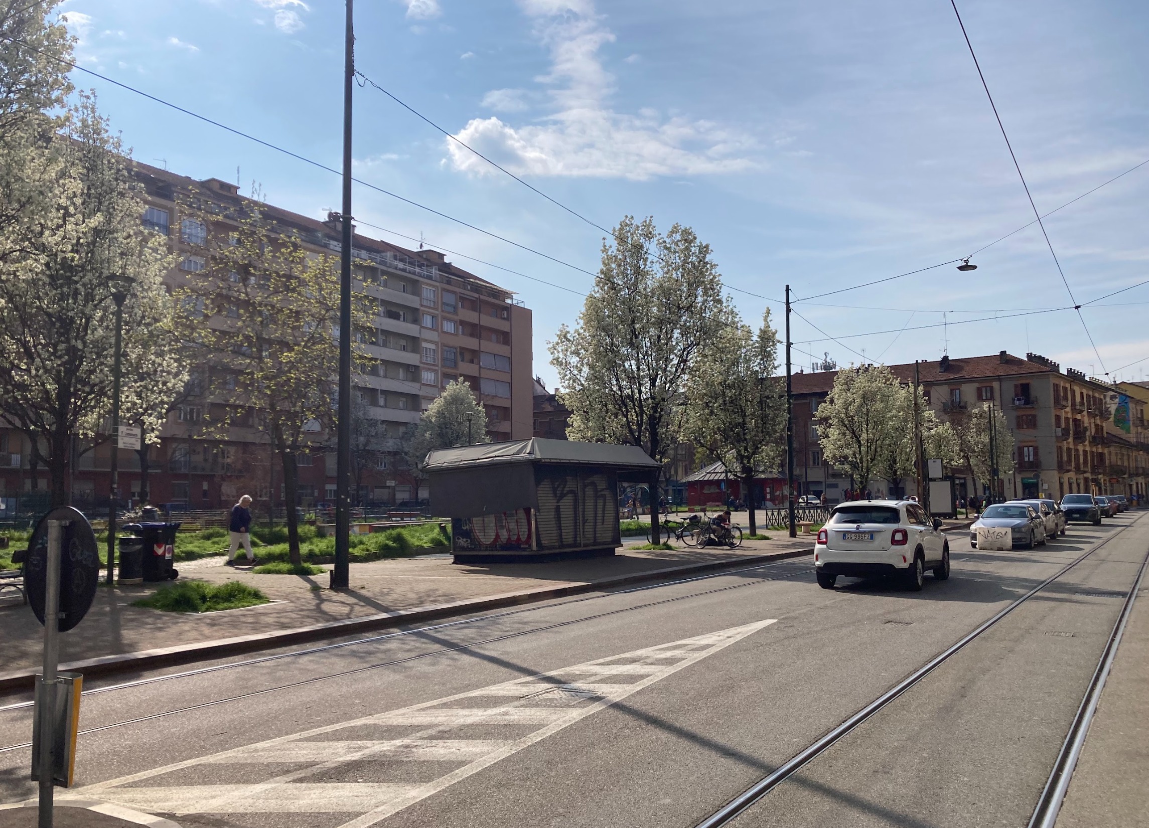 zaha hadid exterior shot render a serene urban scene with a bright clear sky in soft blue with wispy white clouds the mid century residential buildings are in warm beige tones with red brown roofs the lush spring trees are filled with blooming white flowers and vivid green leaves the sidewalks and tram tracks should be a smooth light gray contrasting with darker gray street asphalt capture the gentle sunlight casting long shadows creating a calm and peaceful afternoon atmosphere include a small dark gray kiosk with graffiti and an assortment of white and silver cars parked along the street enhance the scene with warm inviting sunlight and soft ambient lighting architecture
