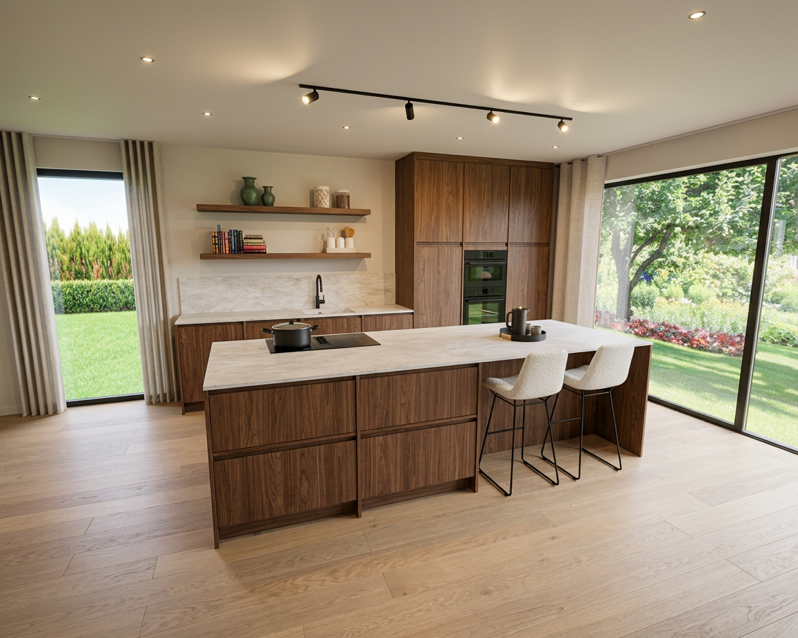 ground floor facade is in dark grey stone color and first floor facade is in dark green color roof is in anthracite black color garage is in dark grey stone and on the garage roof there is metal railing with small beams remove every furniture doors and windows are in black color