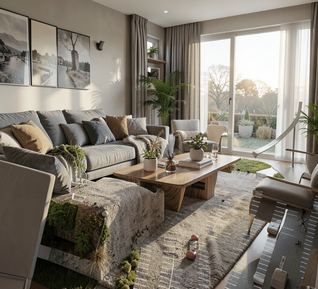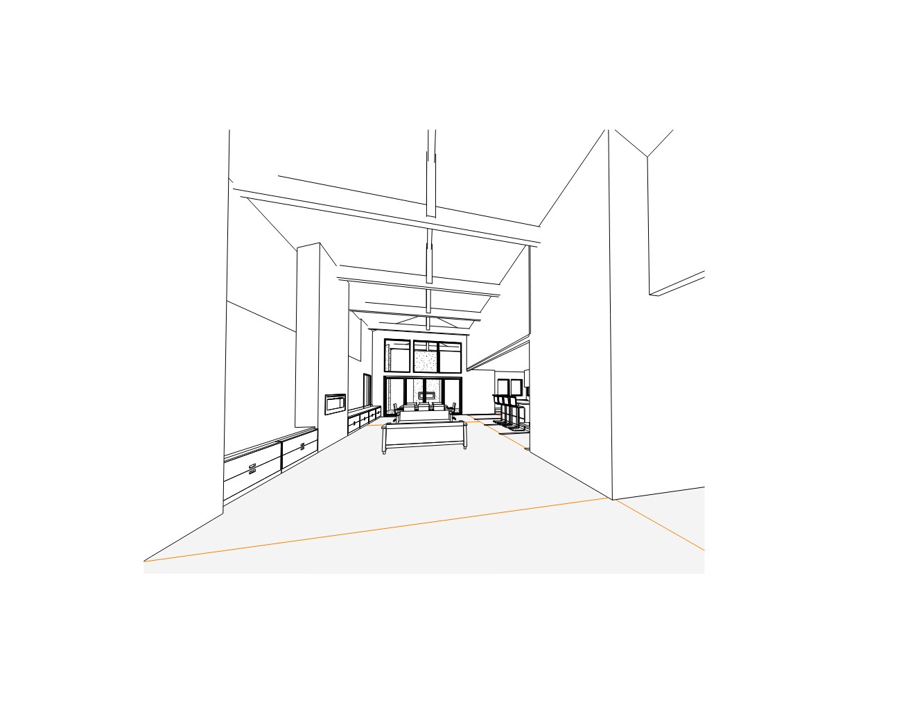 modern farmhouse interior with black frame windows light wood floor vaulted ceiling on the left