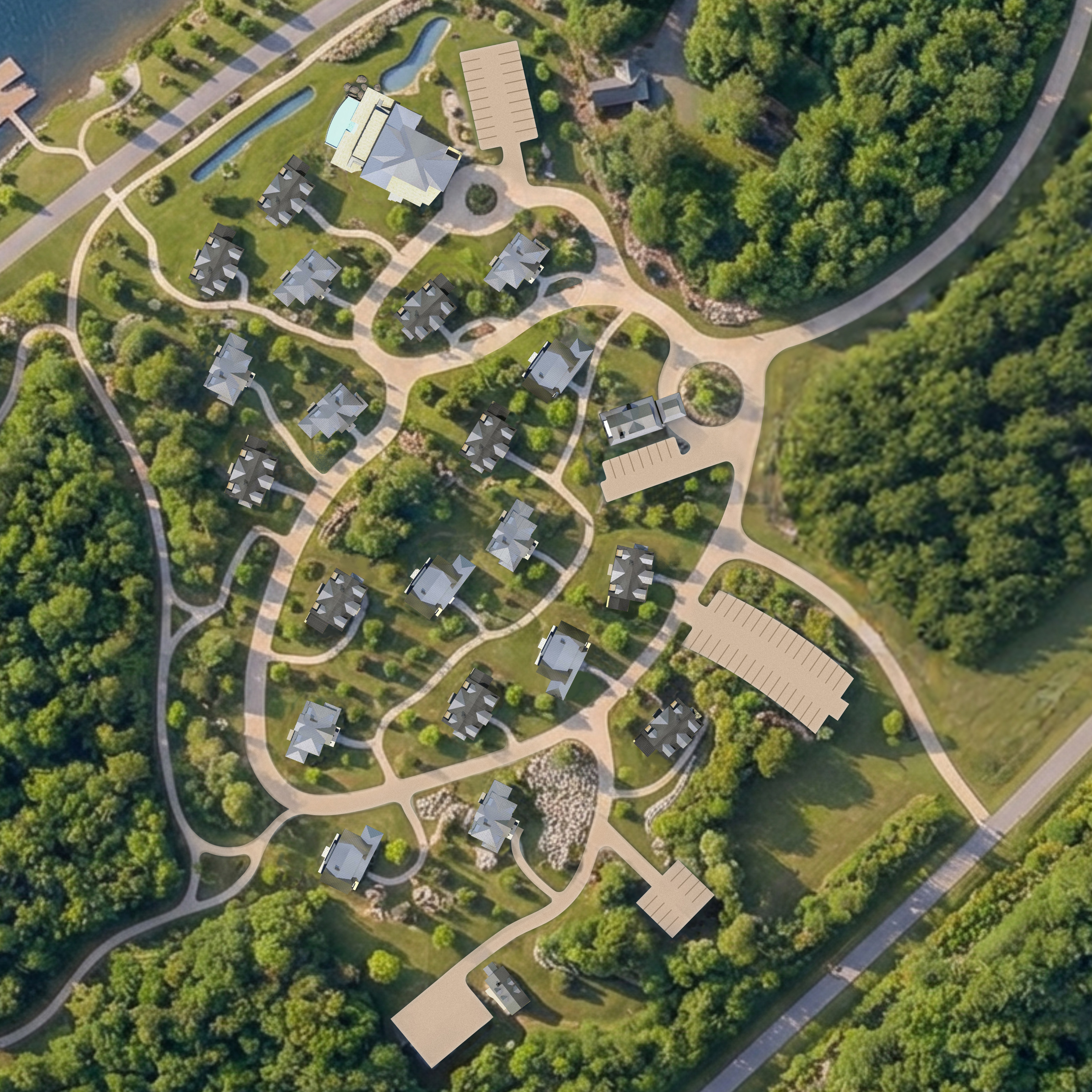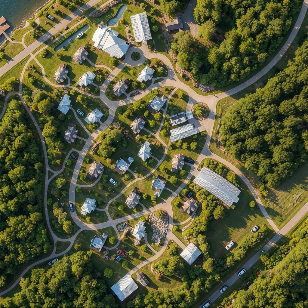 top view site map natural lighting keep the size as is keep the aerial dead on top view add a few cars in the parking lots metal seamed roofs on the houses