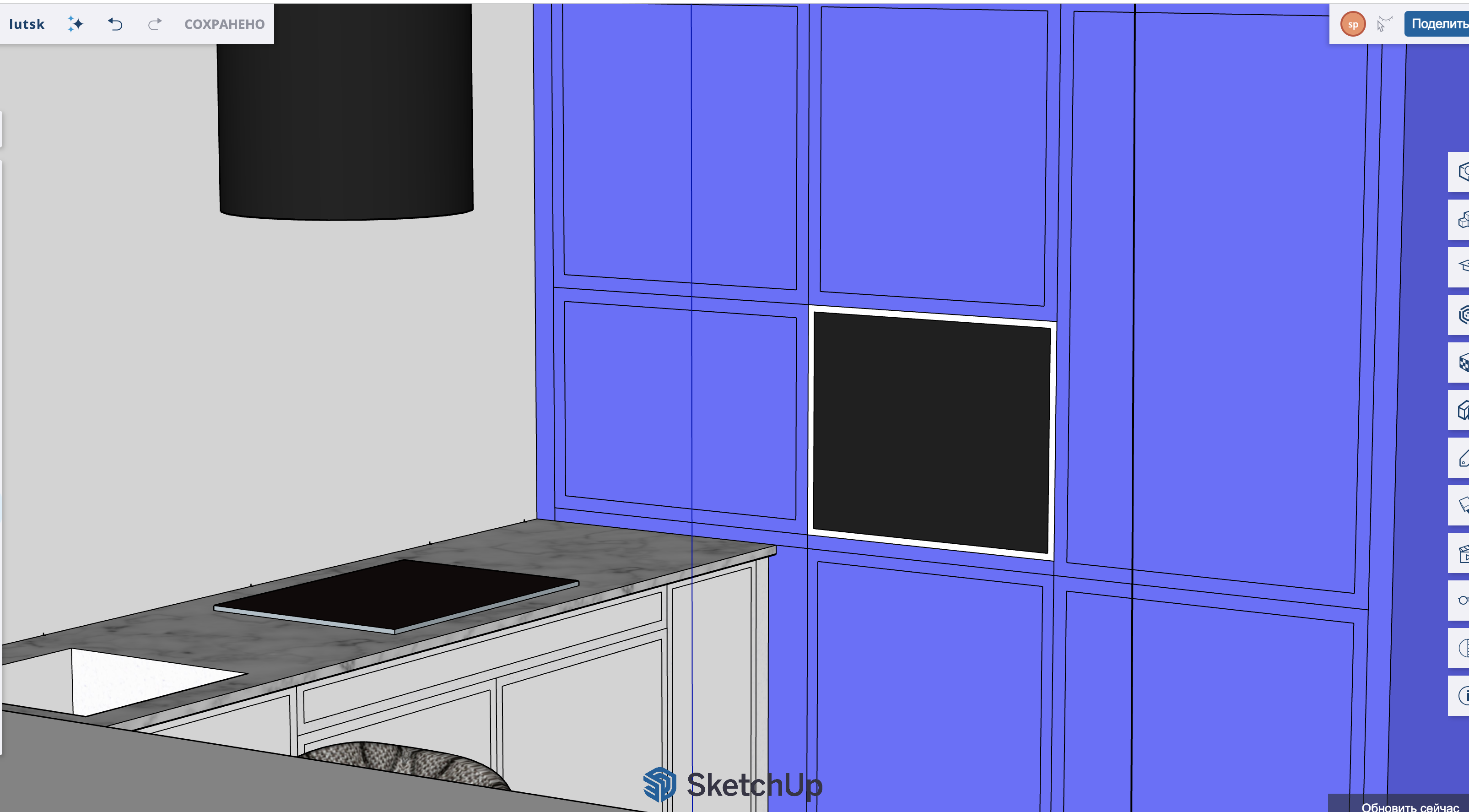 a modern kitchen interior design with a sleek industrial atmosphere the cabinetry on the right is a vibrant royal blue accented with a soft matte finish the countertop is a polished gray marble with subtle veining adding a luxurious touch the induction cooktop is a glossy black seamlessly integrated into the countertop a minimalist black cylindrical pendant light hangs above the countertop casting a soft glow the walls are a light neutral gray providing a calm backdrop the overall ambiance is bright and contemporary infused with a sense of elegance and modernity