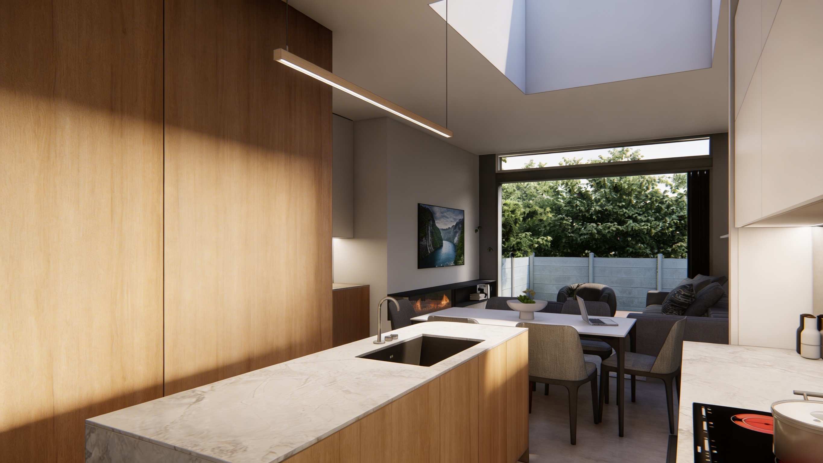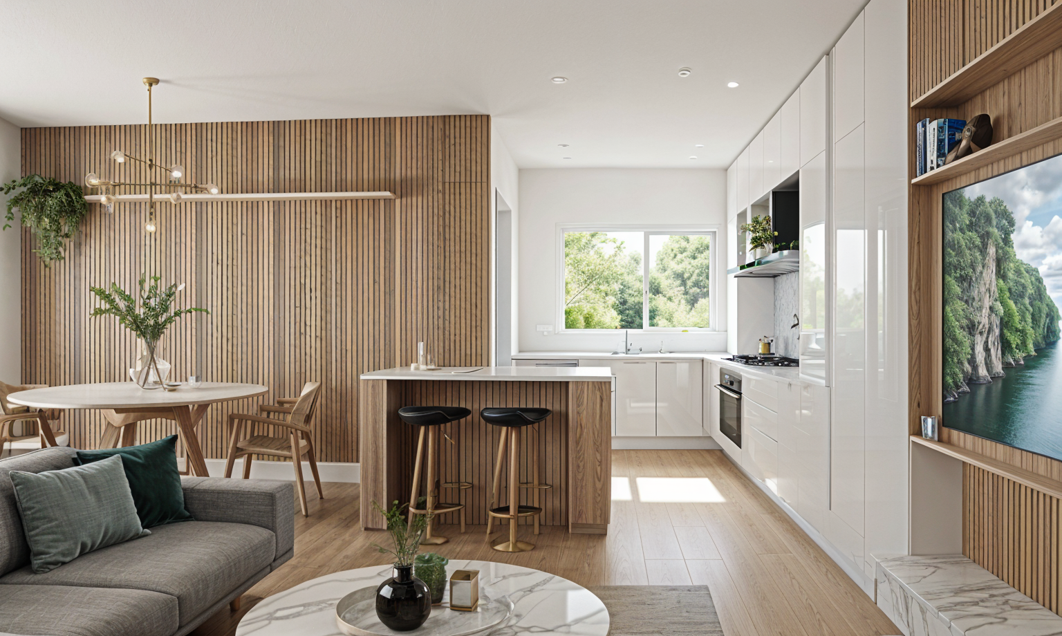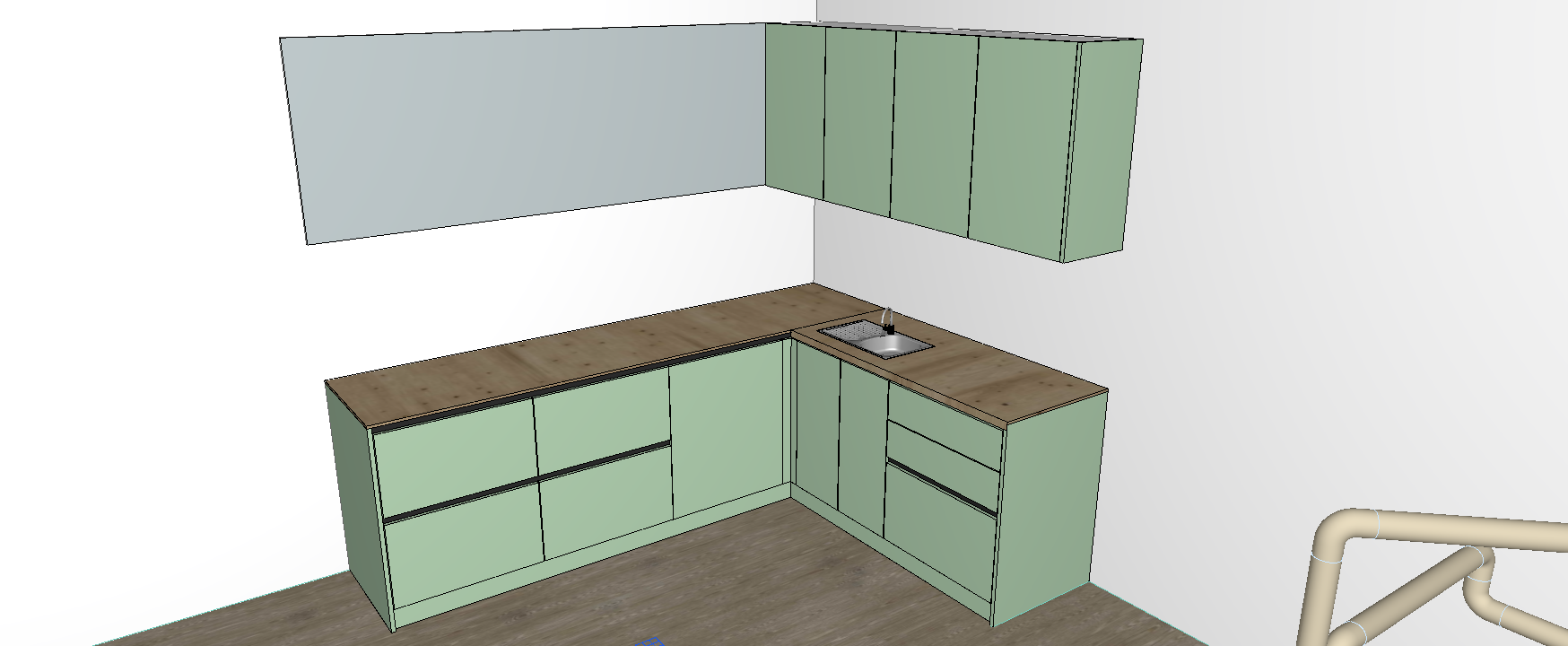 highly realistic kitchen render preserve the exact existing design layout dimensions proportions and all original details exactly as modeled do not add remove or modify any elements furniture lighting decorations or materials keep all cabinet lines edges handles joints seams and surfaces exactly as they are in the original project the kitchen doors should remain light olive green with a smooth matte finish and subtle natural texture the worktop should remain natural wood with realistic wood grain soft variations and authentic material depth preserve the exact geometry of the backsplash appliances sink drawers and all cabinetry use soft natural lighting with realistic shadows reflections and ambient light make the materials look premium and photorealistic while keeping the overall appearance identical to the original archicad design focus on realistic textures accurate proportions sharp details and a clean architectural visualization without changing anything in the scene
