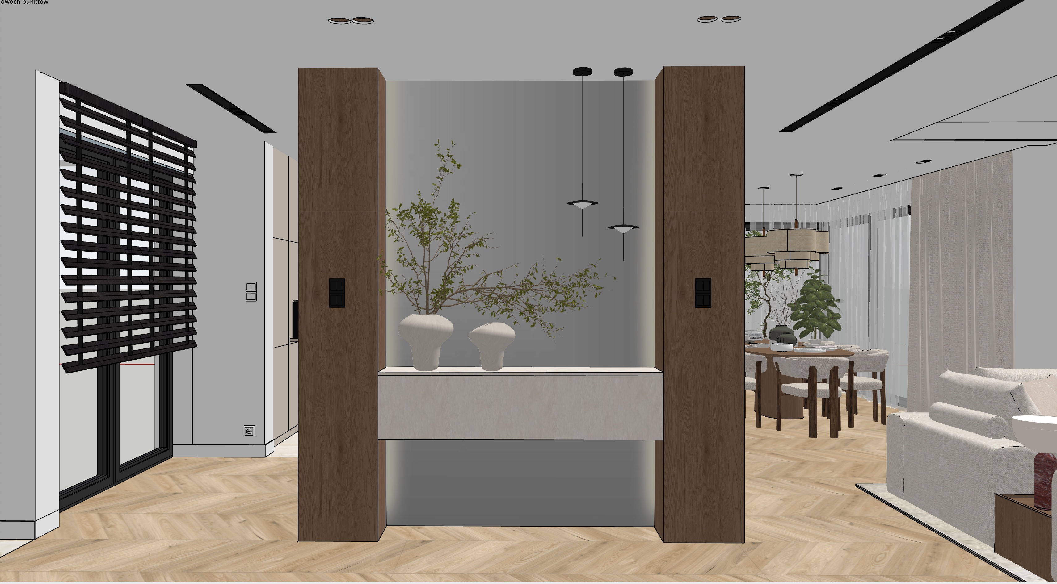the floor is light and the wood on the walls is walnut colored the blinds on the left side are black
