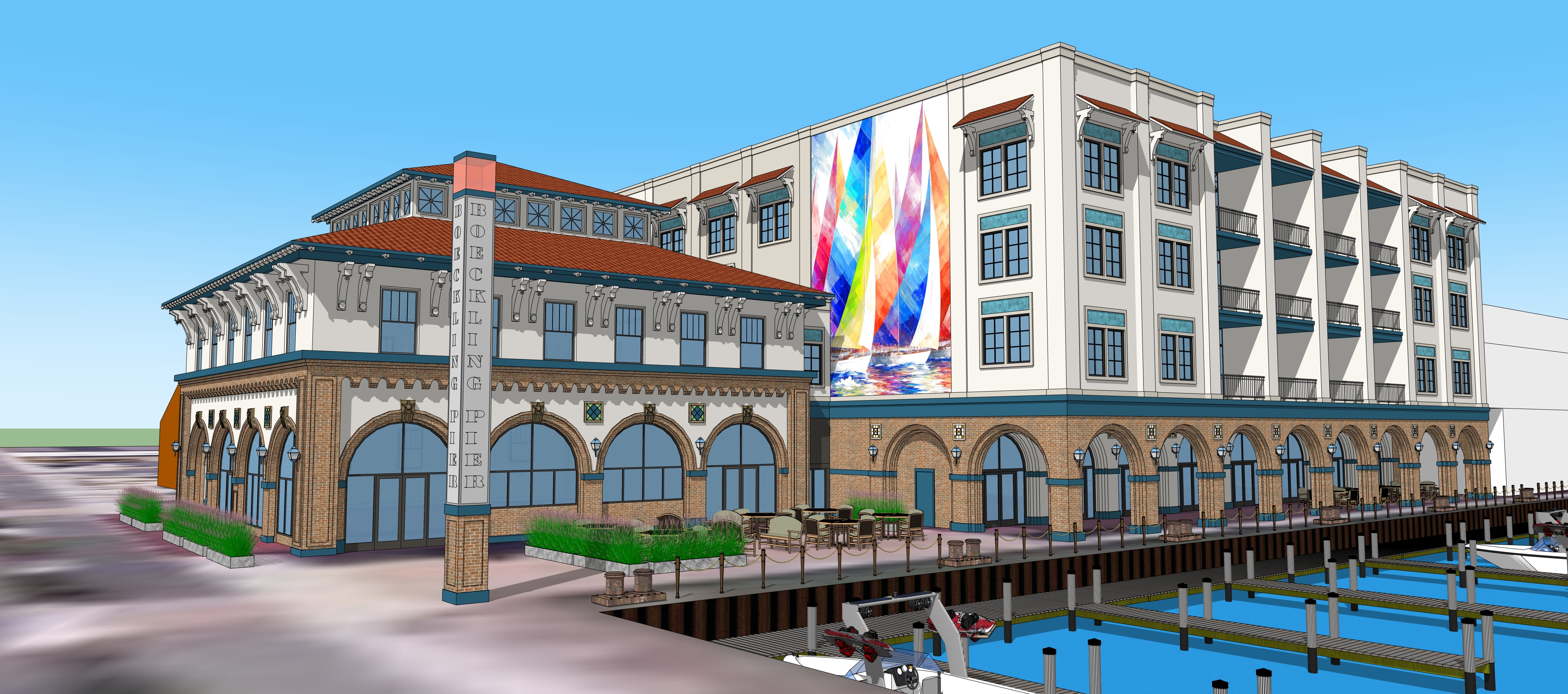 photoreal paint over re render of the provided high resolution sketchup image of a waterfront pier development in sandusky ohio on lake erie match the camera position perspective horizon line and framing exactly to the input image absolute scale geometry lock critical the historic foreground building decorative building with red roof and arched openings is existing historic and must remain exactly as modeled do not change its geometry proportions openings roof shape fa ade details or materials scale anchors the top of the historic building at the upper red roof ridge is 50 8 the top of the proposed hotel condo building behind it is also 50 8 these heights must remain constant and proportional treat the input as a fixed underlay do not move resize warp or redesign any building massing pier edge seawall or architectural elements keep all object silhouettes and edges in the same pixel locations maintain the pier bulkhead sheet piling edge exactly as shown architecture intent refine without redesign proposed hotel condo building mildly traditional compatible with the historic building warm masonry tones simple cornice lines vertically proportioned windows restrained detailing add believable fenestration material realism without changing the massing event center and tower element traditional cues that relate to the historic building masonry base warm neutral stucco or light masonry simple roof forms subtle arches where appropriate but keep it contemporary and clean not overly ornate glazing should be realistic with correct reflections and interior darkness variation context place this site is on a pier in sandusky ohio with an open lake erie horizon line in the background include calm lake water and a distant low horizon no mountains surrounding context should feel like a great lakes waterfront promenade activation people important populate the pier and promenade with lots of realistic activity pedestrians strolling couples families kids people sitting on edges benches some cyclists people taking photos small groups chatting add subtle waterfront elements benches planters railings if already implied trash recycle bins only if they do not change the designed elements and remain consistent with the model lighting season mood summer mostly sunny skies late afternoon warm directional sunlight longer soft shadows natural hdr realistic contrast clean high end archviz photorealism 4k detail no stylized filters materials overall historic building preserve materials and color palette enhance realism masonry texture mortar joints roof tile texture metal glass reflectance without altering design new buildings realistic masonry stucco metal coping glass curtainwall storefront where shown subtle weathering clean but believable do not change the camera angle perspective horizon line or framing do not change scale or proportions of anything do not alter the historic foreground building in any way do not modify the fa ade arches decorative trim window door openings roof shape roof pitch roof color materials or any geometry do not change the overall height of the historic building 50 8 to the top of the upper red roof and do not change the overall height of the proposed hotel condo building also 50 8 to the top do not add floors remove floors add balconies add random roof elements or redesign any building massing do not move or resize the pier seawall bulkhead sheet piling or promenade edges do not introduce fisheye or exaggerated wide angle distortion do not add mountains or non great lakes scenery the background must remain a low flat lake erie horizon do not introduce winter conditions fog or storms do not add illegible signage or text artifacts do not generate deformed people extra limbs distorted faces or duplicate repeated copy paste people keep pedestrians realistic and naturally distributed