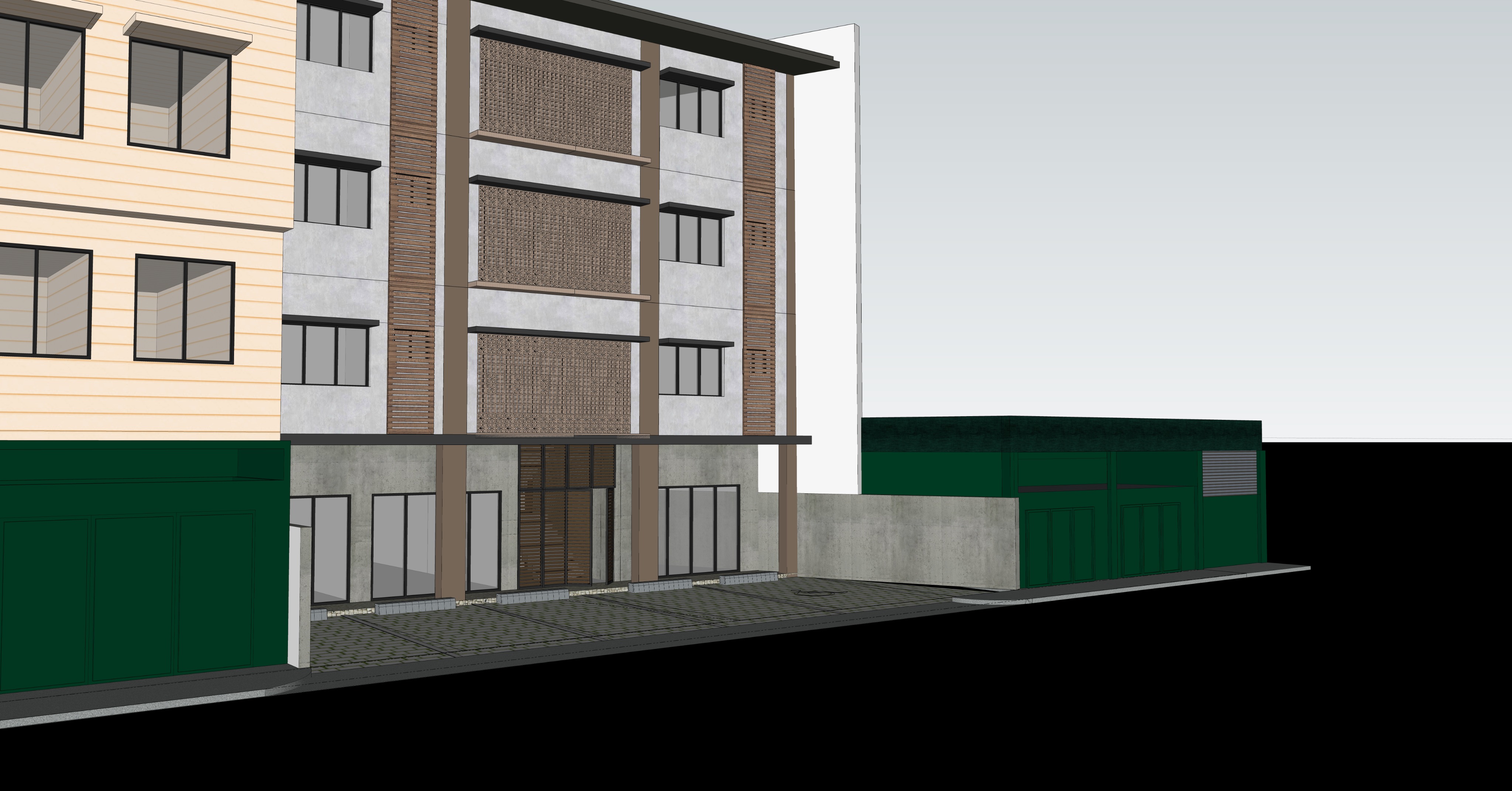 archsynth zero facade alteration strict lock objective photorealistic 3d exterior render strict architectural preservation do not modify architecture main middle building must remain 100 exactly as designed no facade redesign material color changes geometry changes added removed elements added curves added cladding added signage bands decorative upgrades massing adjustments detail simplification preserve entire facade composition breezeblock patterns depth alignment horizontal louvers window grid structural rhythm all proportions and spacing architecture accuracy visual enhancement only improve lighting realism environment weather street realism parking fixed exactly 5 parking slots right side pedestrian strip 1 planter within strip no added removed slots wider slots extended parking pedestrian redesign planter relocation context location private residential street busy philippine city road 6 5m two way time clear tropical daytime lighting warm philippine sunlight soft shadows sky blue with tropical clouds add electric posts overhead wiring street lights subtle under canopy lighting atmosphere modest lived in everyday not upscale adjacent buildings no redesign left 4 storey residential dark green gate slight 5 year aging right 1 storey warehouse green gates slight aging keep original form exactly ground floor main building commercial units no signage bands large signboards added facade features visible interiors small parlor salon chairs mirrors simple lighting small caf small tables simple counter warm modest lighting exterior signage minimal only vehicles only inside 5 slots no street parking vehicle type common philippine sedans small suvs mpvs no luxury or high end brands upper floors residential facade unchanged add subtle realism curtains soft reflections light interior shadows no geometry changes mood mid level mixed use philippine building balanced natural daylight slight street life not crowded not cinematic not dramatic not high end final rule no facade redesign no architectural reinterpretation no parking changes no added elements enhance realism only never redesign retain the gates at the middle of the building