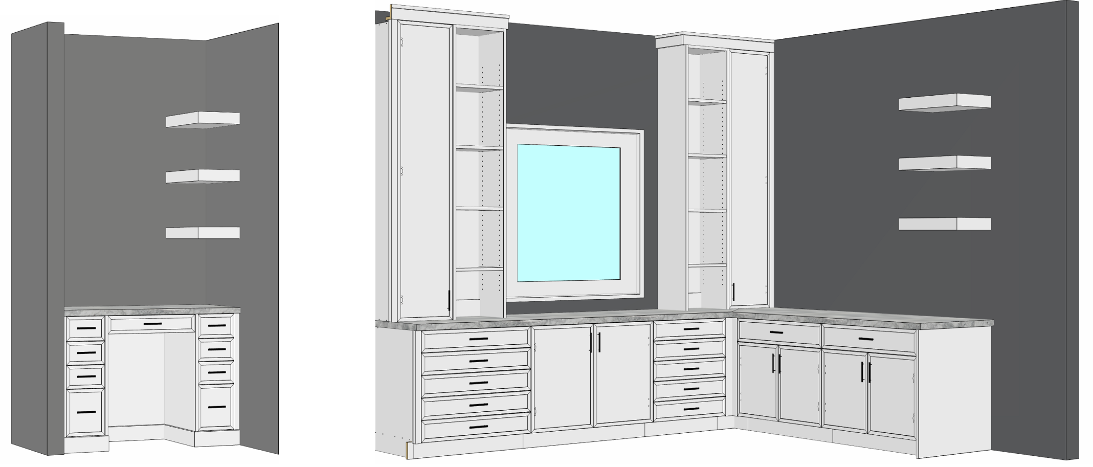 do not change the cabinets in any way preserve the exact cabinet colors materials finishes dimensions door and drawer styles hardware spacing alignment and all geometry exactly as shown do not alter the countertop shape backsplash appliances flooring lighting fixtures or wall structure only remove the construction materials clutter and mess from the scene clean the room and make it look finished and staged add a few simple tasteful home accessories appropriate for the style of the space but do not add or remove any furniture windows or architectural elements maintain the original lighting direction and realism enhance clarity and polish the photo while keeping the cabinetry and room design completely unchanged do not alter the lighting to keep the cabinet colors as they are in the image it is a window that is between the two bookshelves do not add any lighting to the cabinets