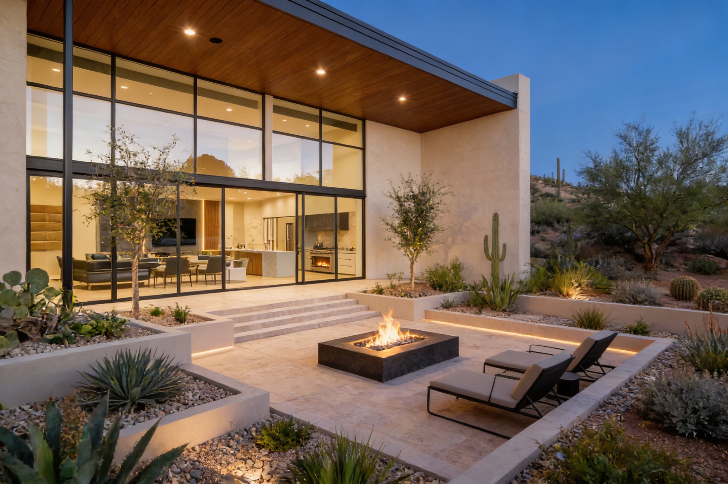 add 3 german vehicules under the first level terrace the ground is in gravel the wood is natural douglas the facade of the main building on the right is with grey stones with lime joints the windows should be a bit longer than wider