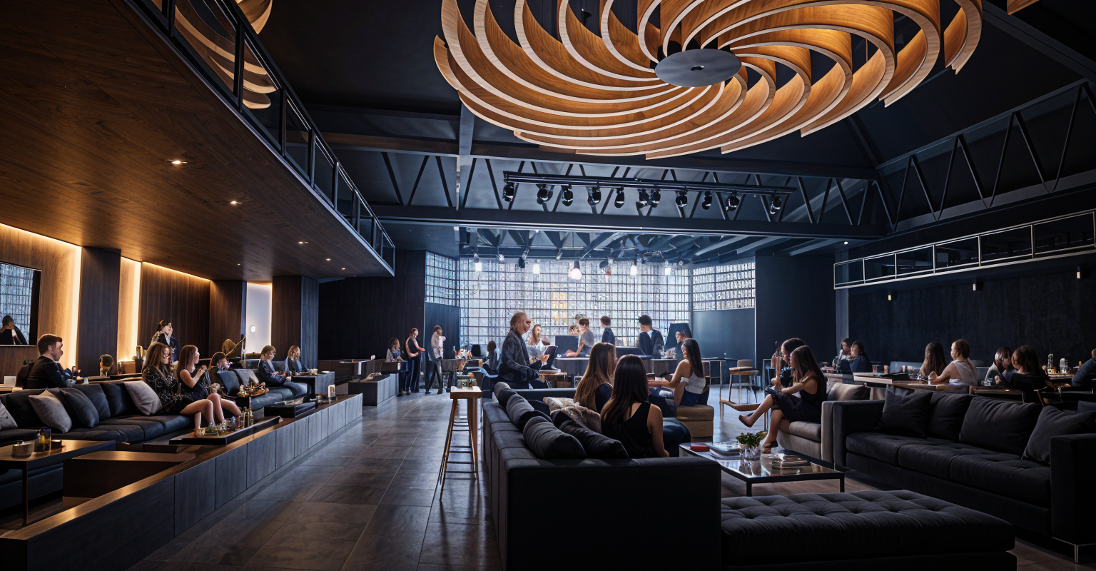 perspective shot upscale nightclub interior at night point of view from the stage looking out toward the house preserve all visible architecture and geometry from this angle exposed steel trusses balcony fronts rear wall and the sculptural wooden ceiling centerpiece polished concrete floor with subtle reflections maintain the high end modern exclusive atmosphere from the previous render add balanced ambient architectural lighting so the room is visible warm cove lighting along balcony edges and architectural lines and focused uplights on the wooden spiral ceiling feature so it glows as a central design element keep dramatic stage lighting behind and above camera casting soft illumination into the audience area populate the room with upscale lounge seating low profile sofas cocktail tables bar height seating along balcony fronts all in luxurious materials like leather velvet brushed metal and dark wood seat and stand an affluent well dressed audience in these areas facing the stage and engaged with the performance density medium not crowded audience posture relaxed and attentive no cheap furniture no clutter no plastic chairs lighting balance should allow the audience and architecture to be visible while still feeling like a live performance environment mood is modern premium energetic and social preserve original camera perspective instruments and visible stage elements in the foreground architecture