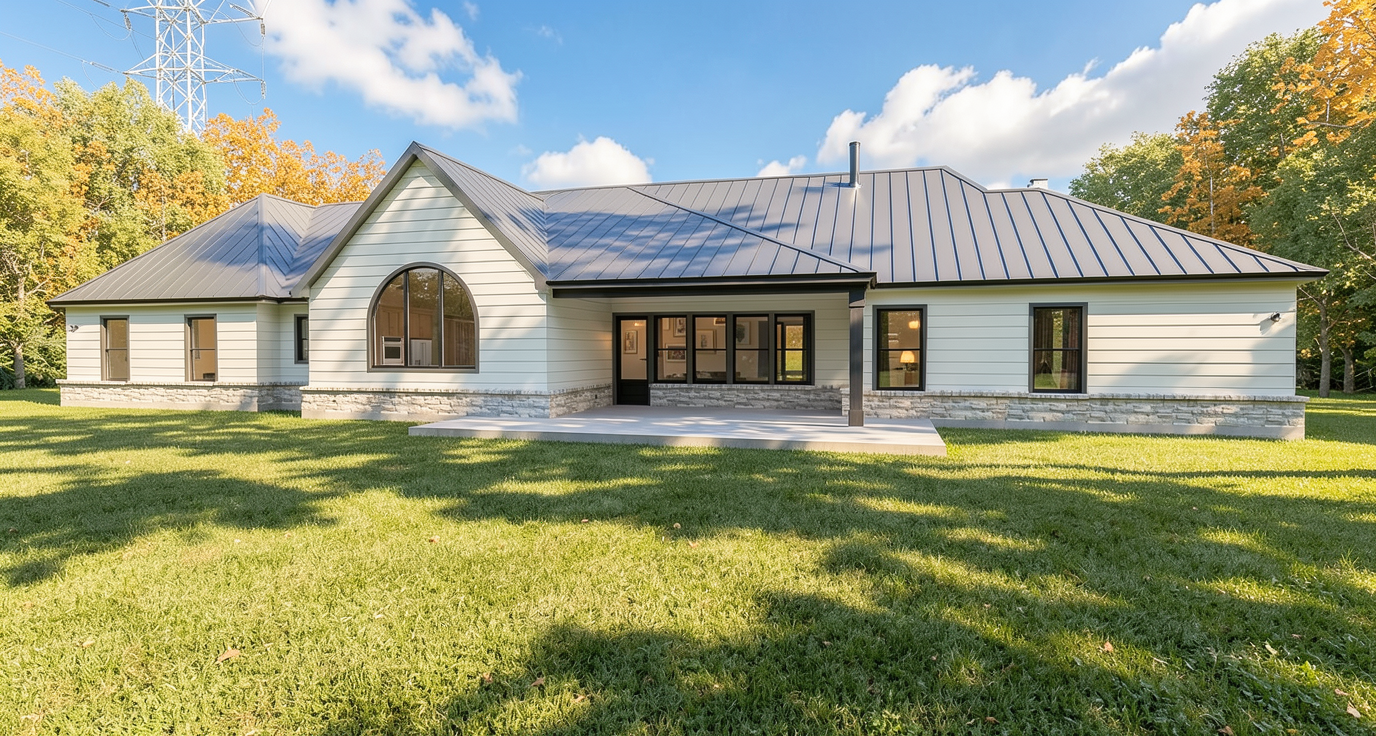 change the white walls to golden buff brickwork blend and change the entrance door to a glazed wider door with no side panel and opening the opposite way windows doors and fascias to be dark anthracite grey keeping everything else the same as the source image