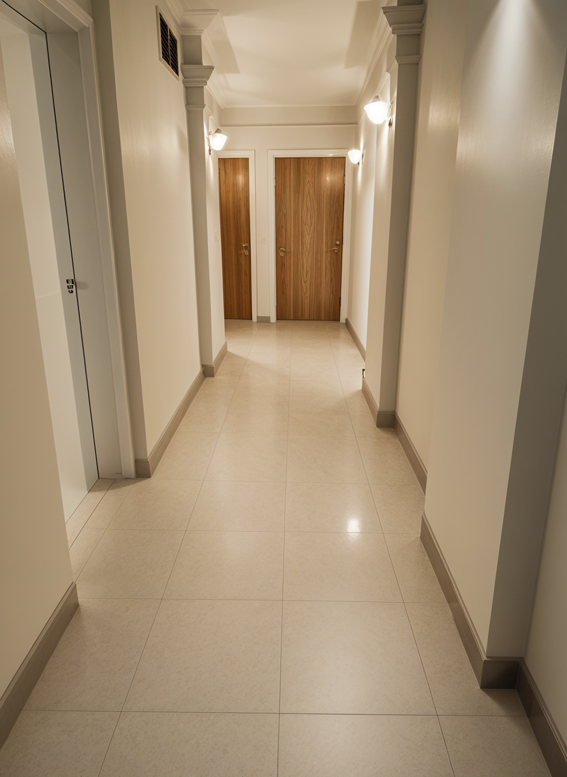 replace the existing wall sconces only swap each existing sconce with a compact modern rectangular white fixture in the exact same location and at the similar size and orientation do not add any new lights do not duplicate fixtures do not change the number of sconces do not modify ceiling lights add recessed lighting add strip lighting or introduce any new light sources keep the overall lighting level and brightness consistent with the original image do not change any other finishes materials colours doors trim or architectural elements