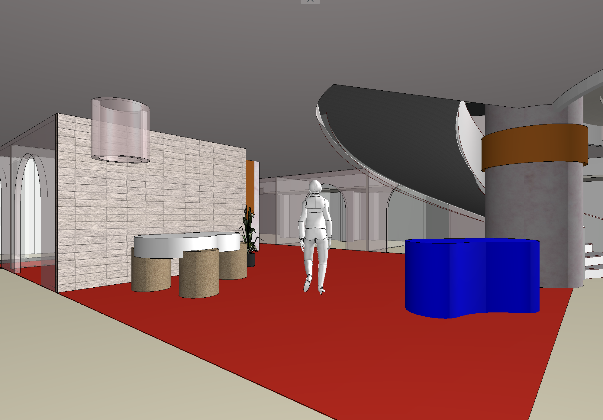the ceiling cylinder pendant in front of wall should be a light pink acrylic with a subtle glow inside the red floor should be a colourful terrazzo the tabletop in front of brick wall should be a silver mirror finish the legs should be in textured sandstone the round column should be in a heavy white painted texture render the ring around the column should be in terracotta finish with upper case neon sign stating skin sanctuary the rooms with arch entries should be in a soft pink glass finish the curved stiarcase should be in white on the ceiling we should see downlights the plant should read as 2 lush fiddle leafs at different heights in terracotta pots