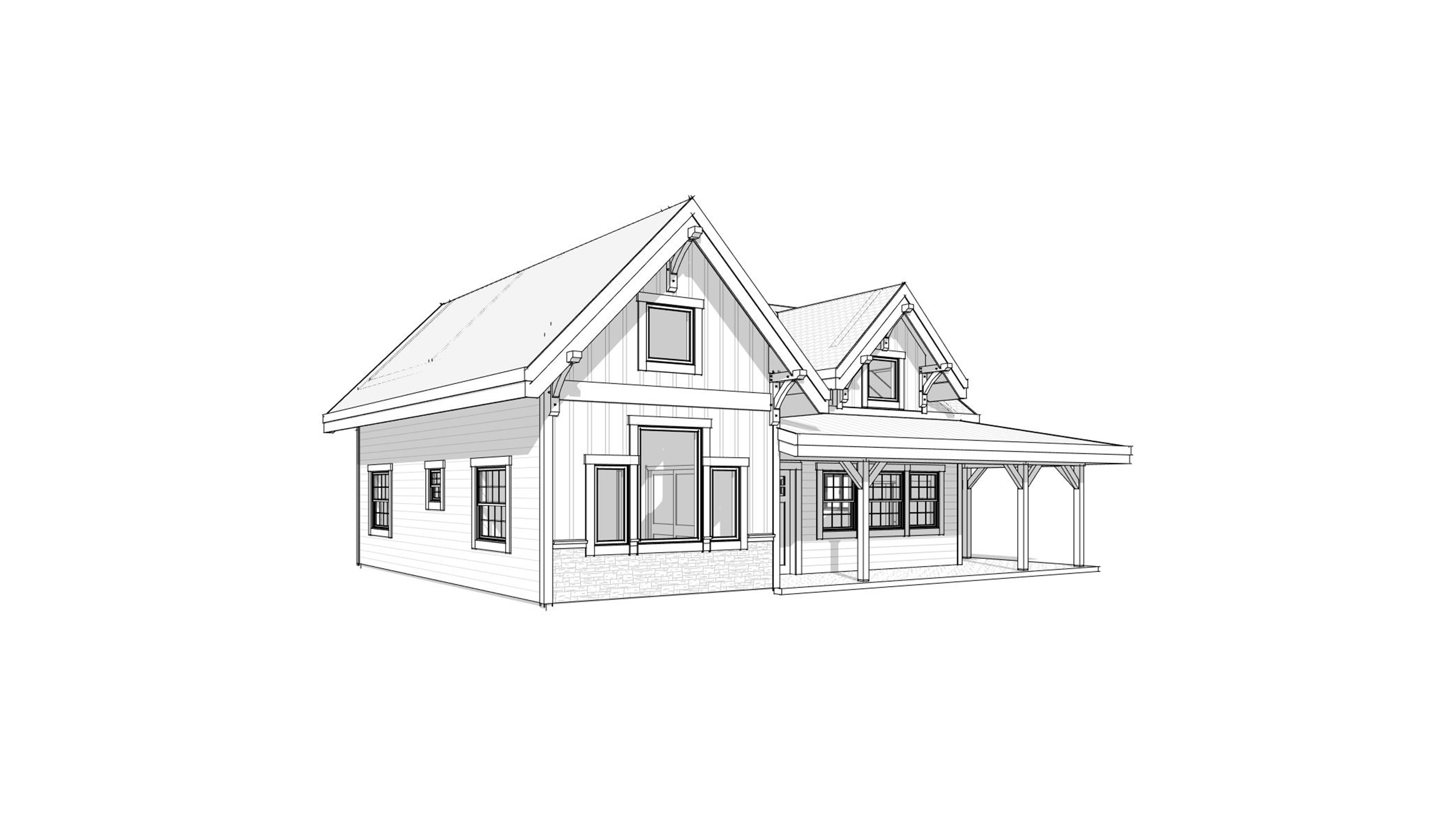 clean rustic cabin architectural exterior home rendered in cinematic vibrant daytime lighting with blue skies and sparse clouds in the sky concrete driveway leading up to the house lined with hedges warm glow and reflections off of the windows light stone wainscoting on front left of cabin select grade wood cedar siding green manicured landscape around structure with hedges and gardens and patches of grass black standing seam metal roof prominent cinematic small river with small rapids and big fir trees behind the house in the background high fidelity photorealistic visualization crisp shadow falloff refined facade geometry soft atmospheric depth premium architectural photography mood ultra clean composition and materials dark trim around windows