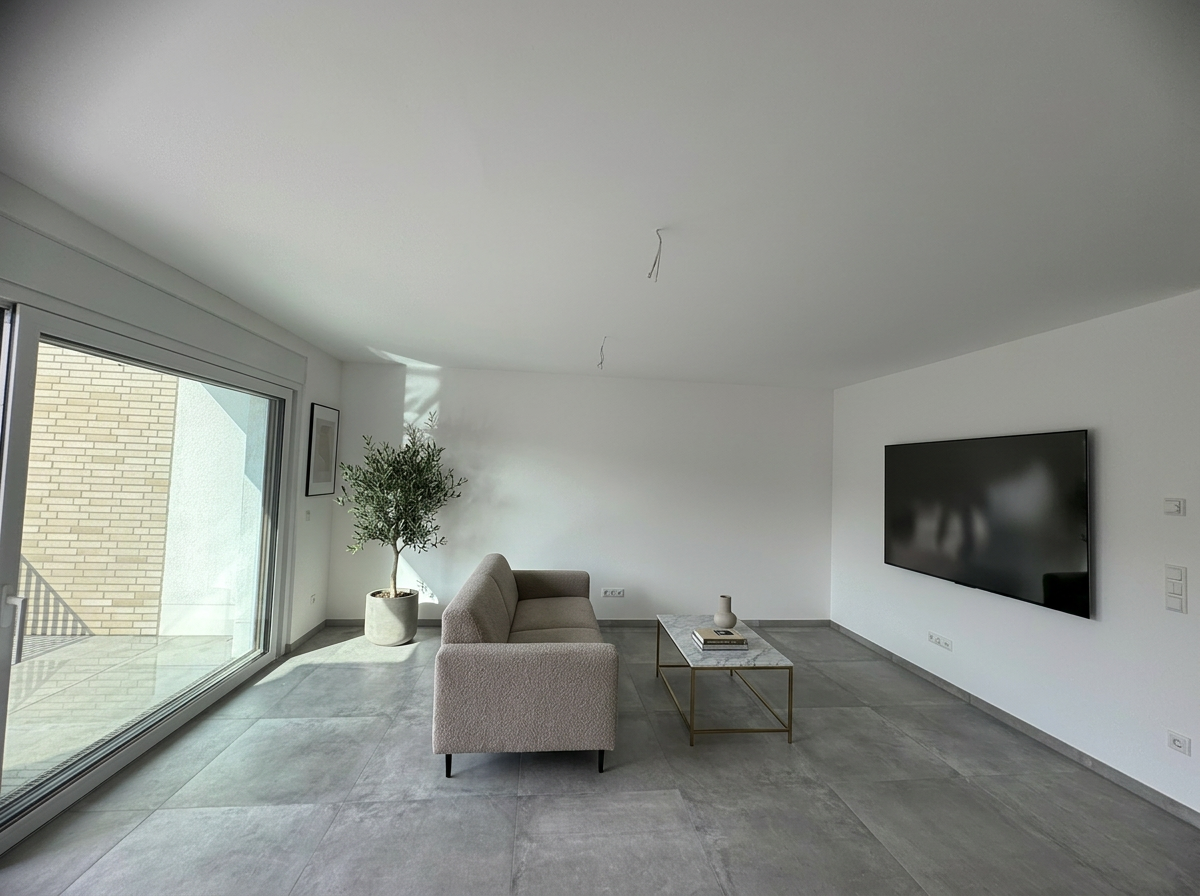 make this rendering photo realistic keep everything as it is natural bright golden daylight the floor and the chimney should be without texture smooth and in beige grey plaster carpet wool structure curtains start directly under the ceiling no gap between ceiling and curtains