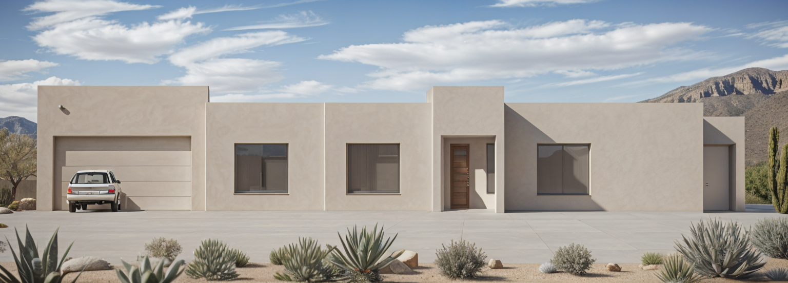 tan brown stucco in ariona desert with mountain entry tower is pushed back