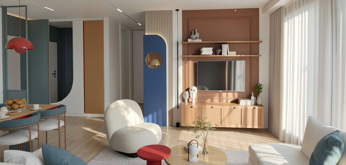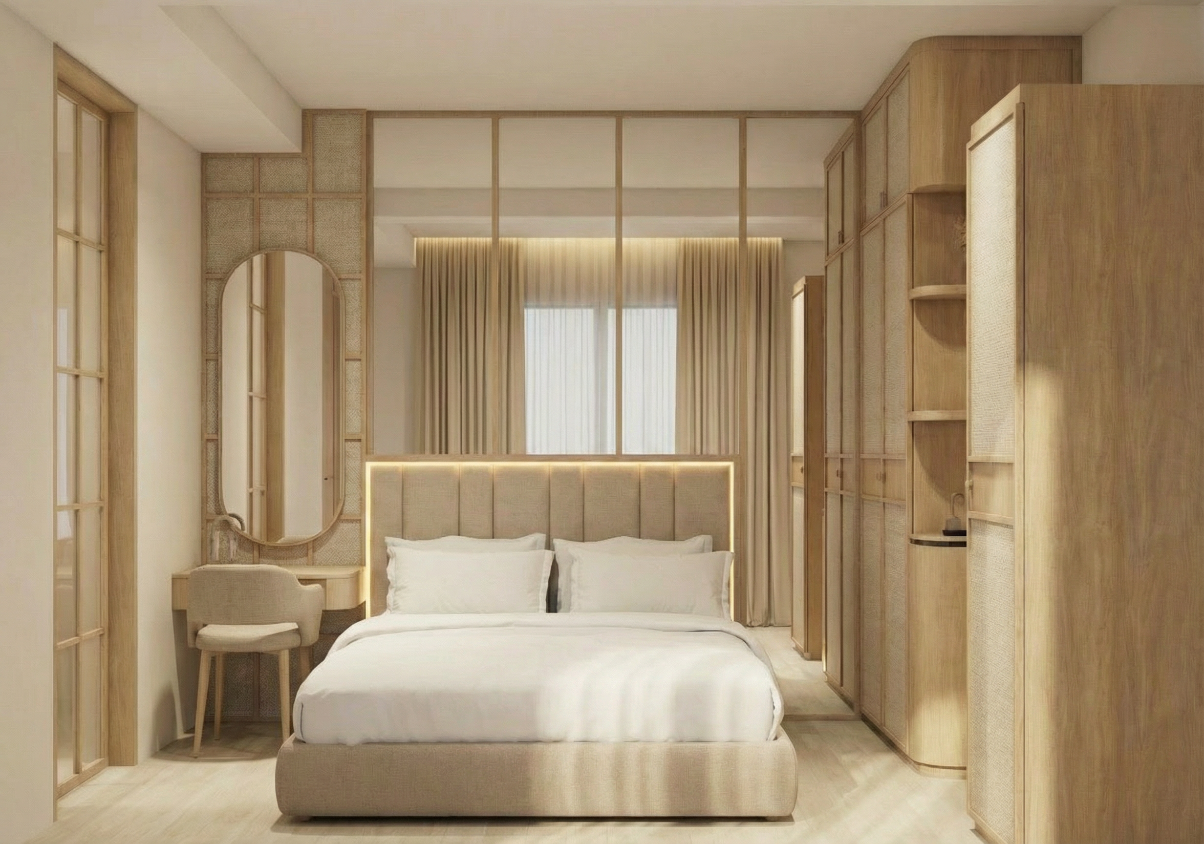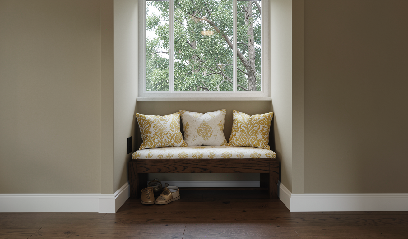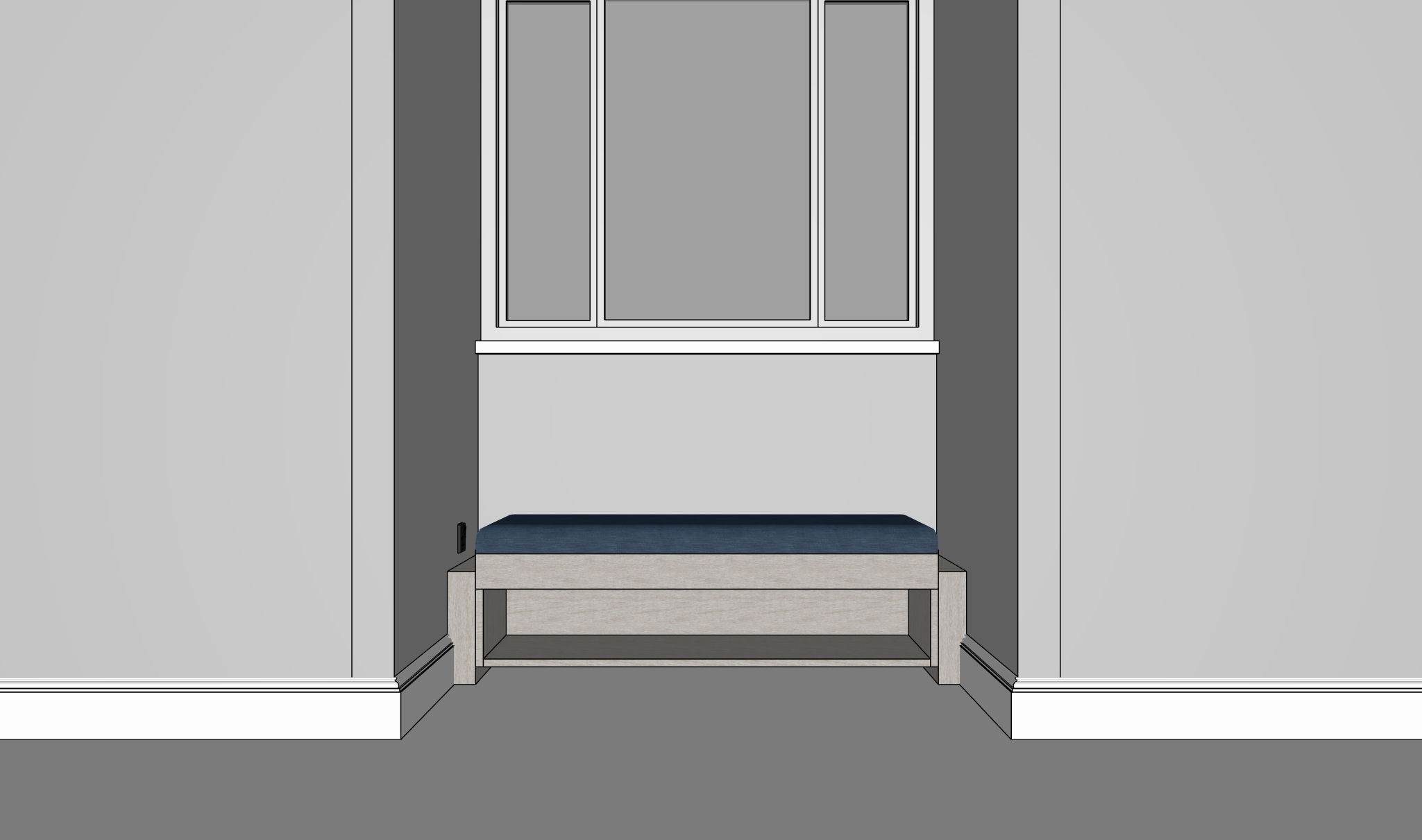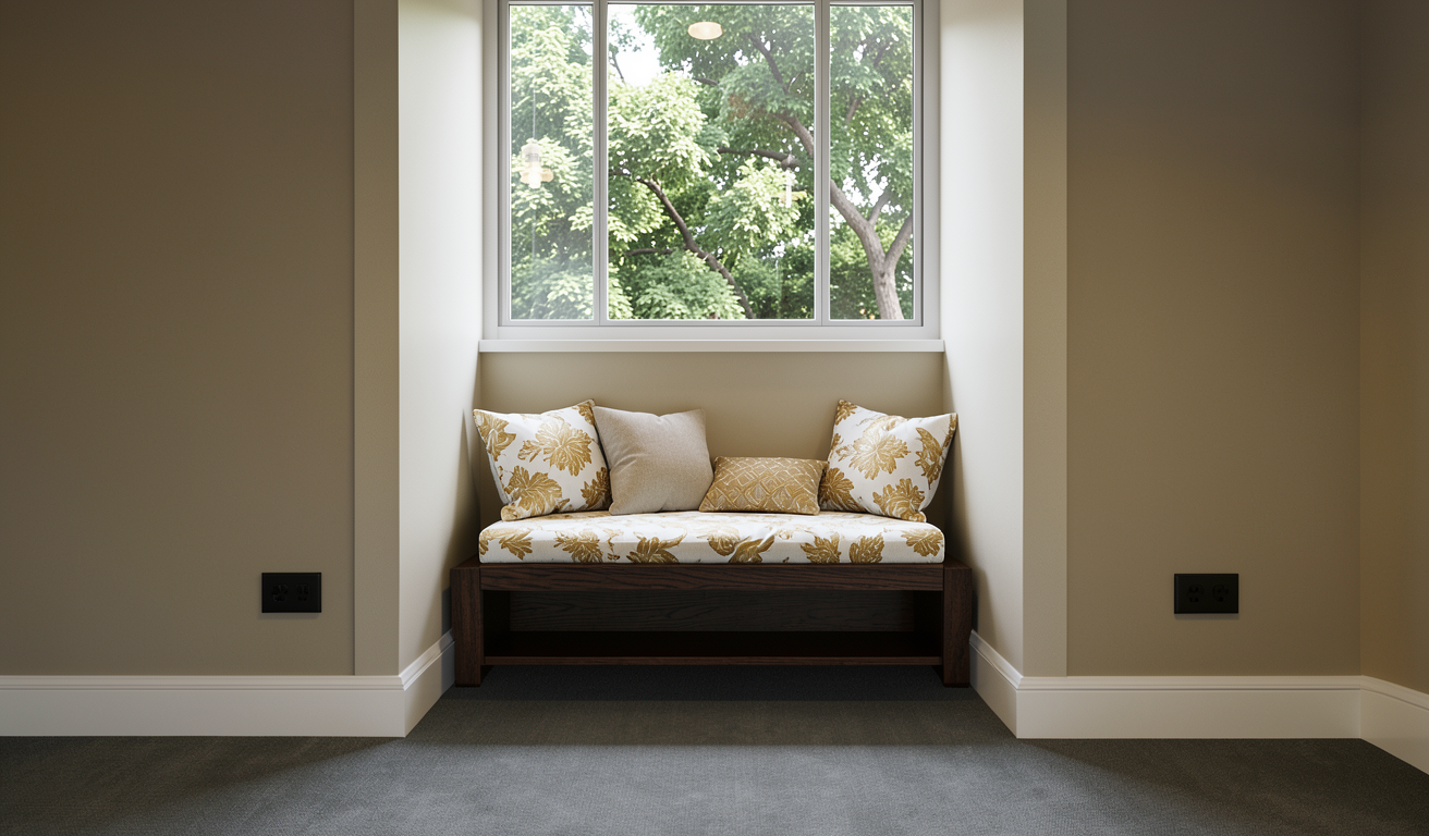 render this window seating without changing the design add a realistic 1st floor trees background on the window wall color a bit beige and skirting white make the bench material realistic change the material finish into white oak for the base and grey fabric for the cushion add pillow cushions remove led strip make the lighting a bit dim don t change the color of the socket still use black dark grey add accessories below on the lower shelf do not add more socket