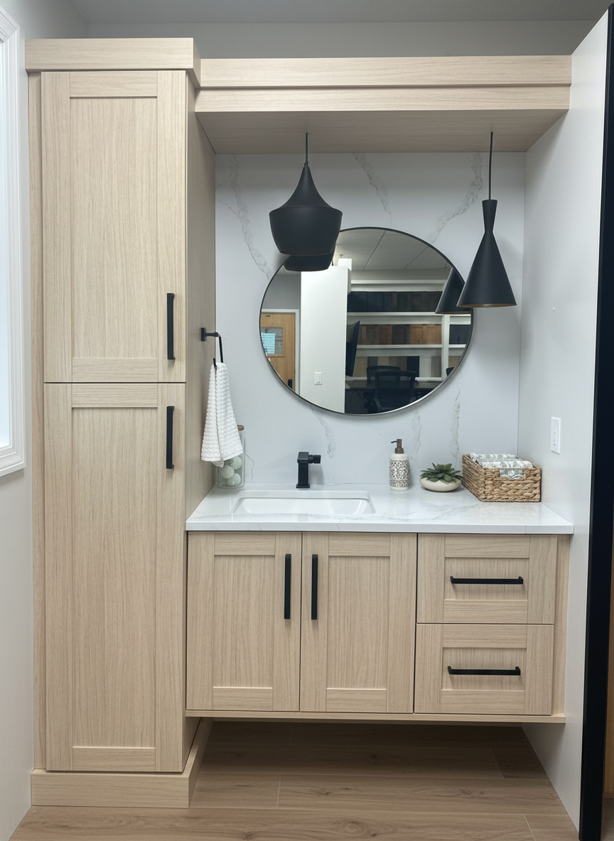 put this vanity in a residential home with new flooring and drywall on each side get rid of the acoustic ceiling tile and replace with drywall include natural light restage the countertop get rid of the person in the reflection get rid of the cardboard box on the floor below the vanity change the reflection in the mirror to show a luxurious shower in the background do not change the cabinets at all keep the valance above