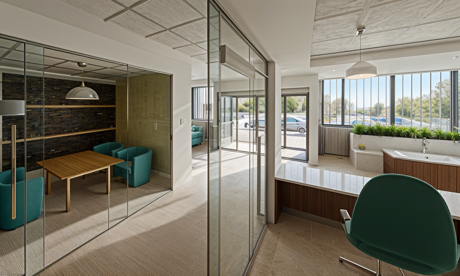 render a modern office interior featuring transparent glass walls and an open layout use a soft warm lighting to create an inviting atmosphere for colors apply warm beige for the wooden floor soft white for the walls and deep teal for upholstered chairs highlight the desk with a rich dark wood tone ensure the ceiling has a light gray color to complement the modern aesthetic add subtle green plants near the window for a touch of nature and use a geometric patterned wall design in muted gold and black for a sophisticated backdrop