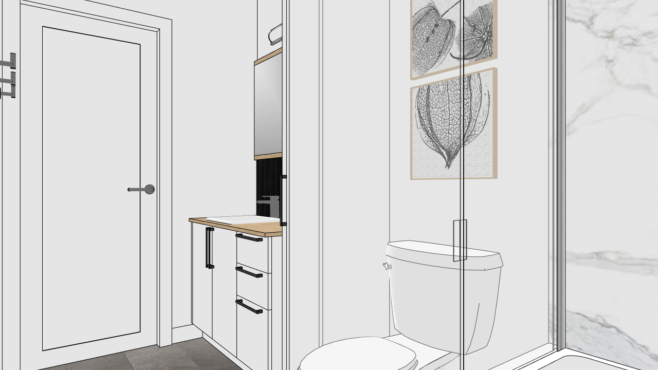 generate a photorealistic rendering of this small residential bathroom bathroom materials white cabinets in sublime polymer with a matte finish wood effect cabinets in tafisa melamine color m2007 shower wall in murluxe panels matte white calacatta effect chrome faucets handle in black glossy black wall tile torlys vinyl flooring evertile product cambridge color the only source of lighting will be recessed ceiling lights