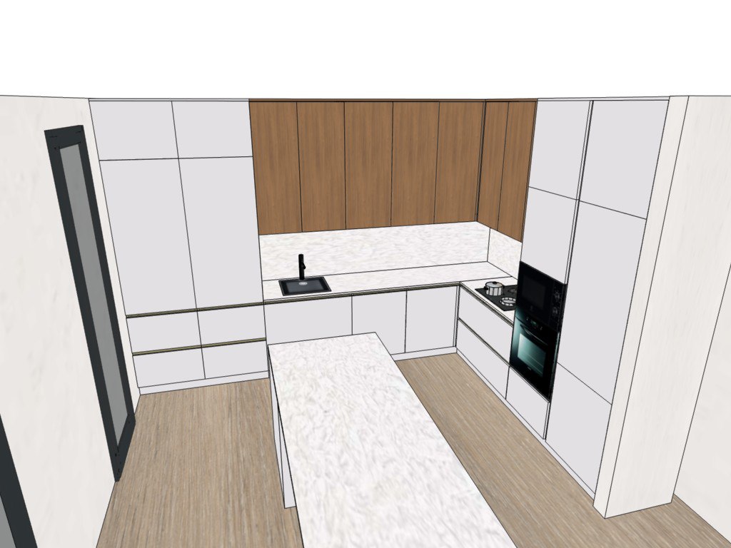 kitchen interior with a modern minimalist design use a snoji white sw color the walls countertop should be porcelain grey beige slight structured create 4 seats in the island also with lightweight light wood chairs the kitchen should feature mate cashmire cabinetry and upper cabinets should be egger oak brown casella incorporate a stainless steel kitchen sink and stainless steel j faucet for contrast the oven and stovetop are sleek and contemporary in a reflective black finish the flooring is a warm light oak wood enhancing the cozy atmosphere large window with a black frame on the left allowing natural light to flood in creating a bright and inviting ambiance the atmosphere is clean modern and welcoming