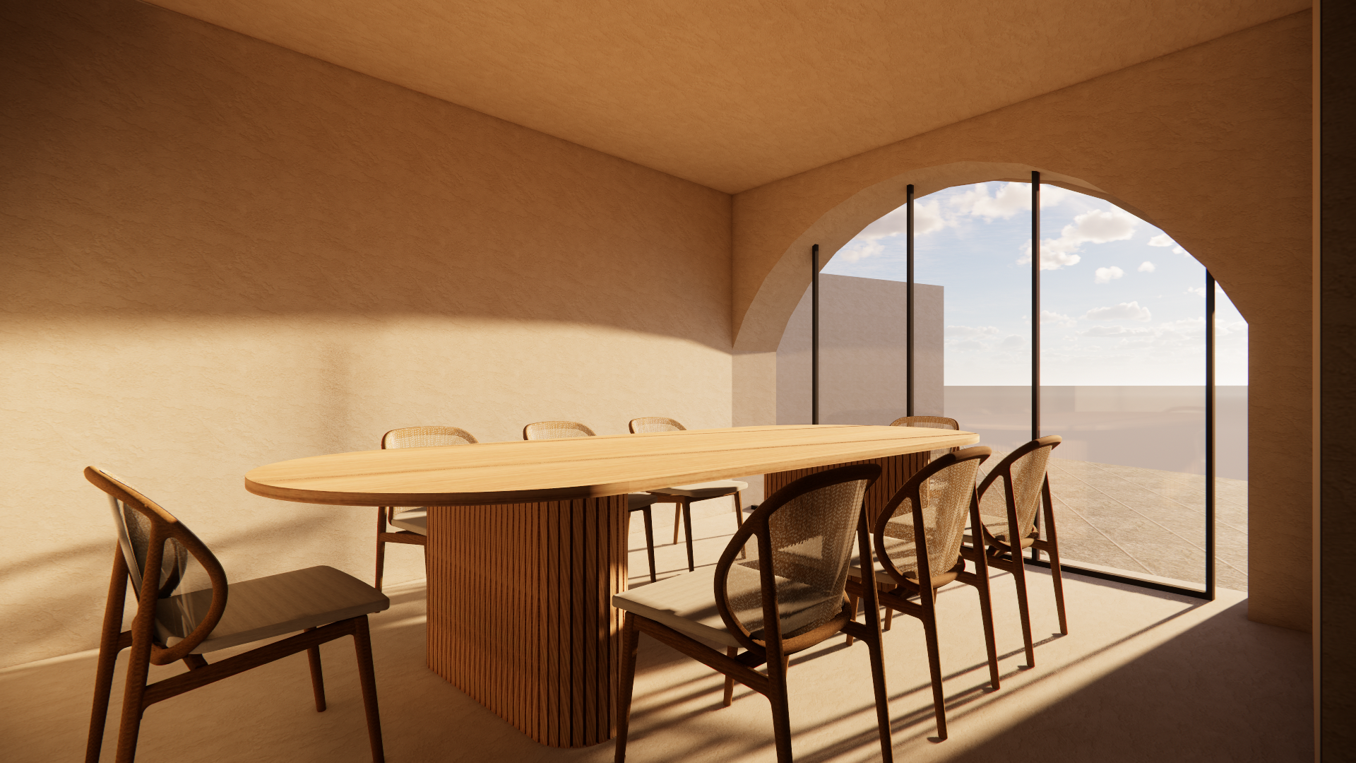 a vip dining room within a high end restaurant and hookah lounge in djibouti asta studio the design follows the same arabic modern aesthetic as the main dining space elegant warm and minimal yet richly detailed keep the angle of the render as close as possible to the reference image the room features beige stucco walls arched openings and a wooden ceiling with integrated linear lighting at the center stands a large dining table made of solid natural wood or light marble surrounded by refined upholstered chairs with curved silhouettes the table should feel sculptural and anchor the space with a sense of ceremony and exclusivity above or near the table include a central art piece either a hanging light sculpture textured wall installation or freestanding artistic centerpiece that serves as the room s focal point the art should reflect local craftsmanship or modern arabic motifs with a contemporary touch introduce layered lighting warm spotlights on the table and art piece soft indirect light along the ceiling panels and wall washers to emphasize the texture of the stucco the ambiance should feel intimate and high end ideal for private dinners or executive gatherings add lush greenery sparingly perhaps a few potted plants or planters integrated near the walls to bring softness and freshness to the space brass or brushed metal accents can appear in the lighting fixtures chair legs or table detailing to enhance the feeling of luxury the mood is refined warm and serene with a marina and city view visible from the left side through elegant glass openings subtly connecting the interior s golden tones with the reflections of venice road s waterfront