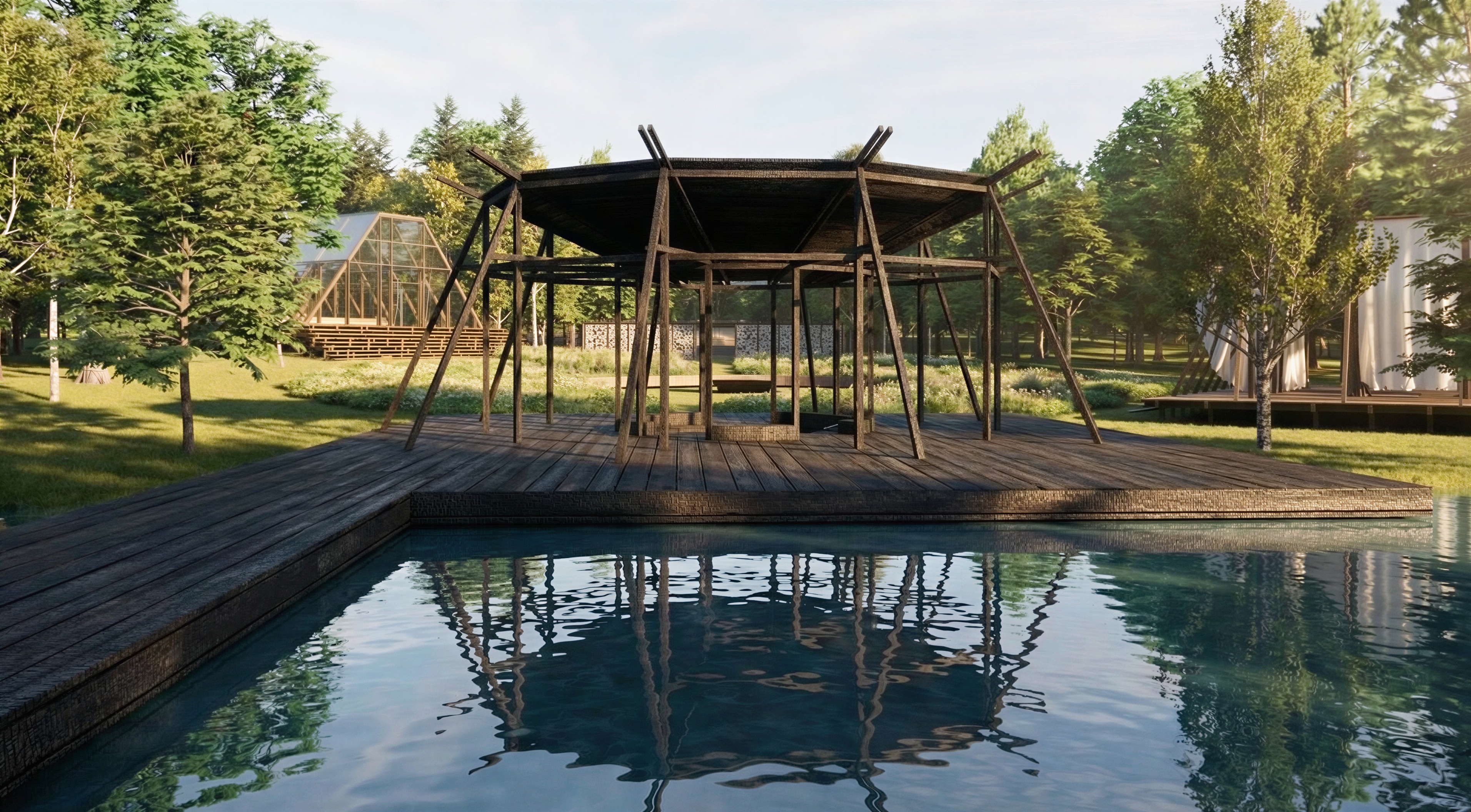 building in the direct foreground had sheet metal roof charred wood structure keep architecture as it is