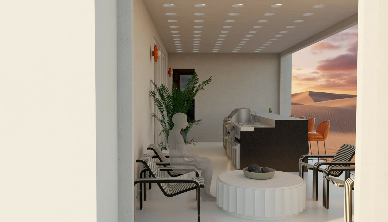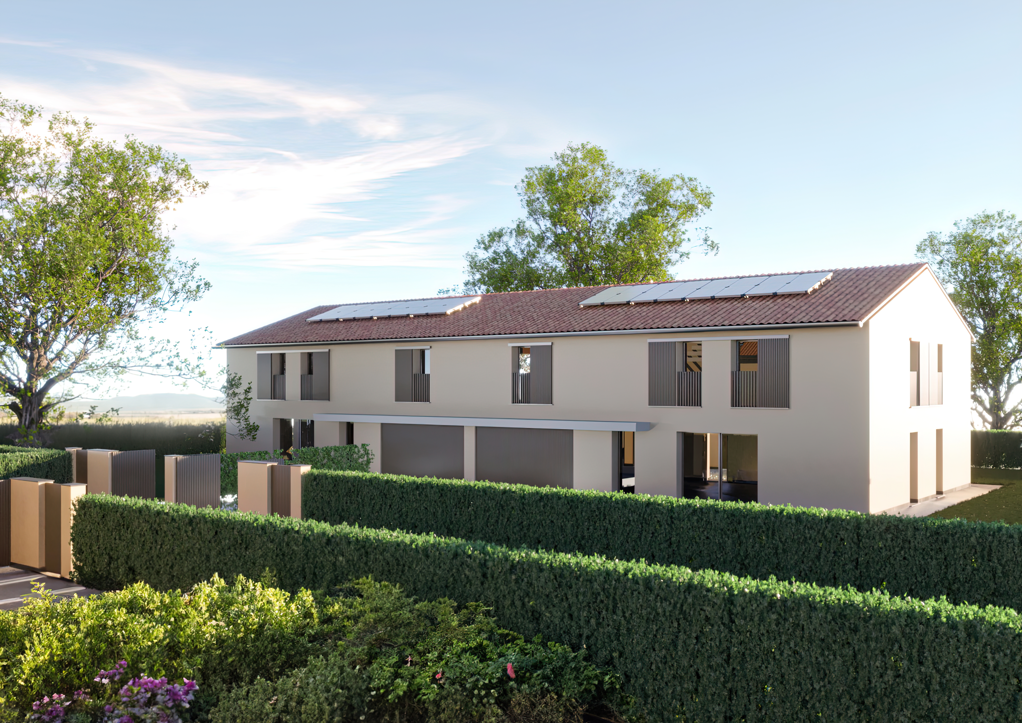 photo of a contemporary residential building showcasing minimalist architectural design featuring smooth beige stucco walls large windows with wooden slats and a sloped roof adorned with solar panels the urban setting includes neatly trimmed greenery and a pathway leading to the entrance morning sunlight casts gentle shadows on the facade highlighting textures and details captured from a low angle with a wide angle lens the perspective emphasizes the inviting entrance and surrounding garden creating a harmonious blend of nature and modern living