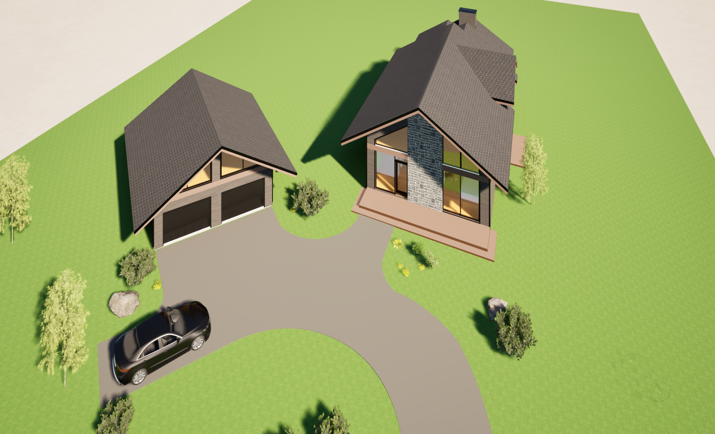 partir de cette image en conservant strictement et sans modification les couleurs bois noir et brun le toit en bardeau d asphalte ne pas interpr ter ni remplacer les mat riaux teinte texture orientation conserver exactement les volumes et proportions du b timent int grer le b timent dans un environnement naturel cr dible avec une v g tation typique du qu bec mettre du gazon au pourtour de la maison combler les trous de foret