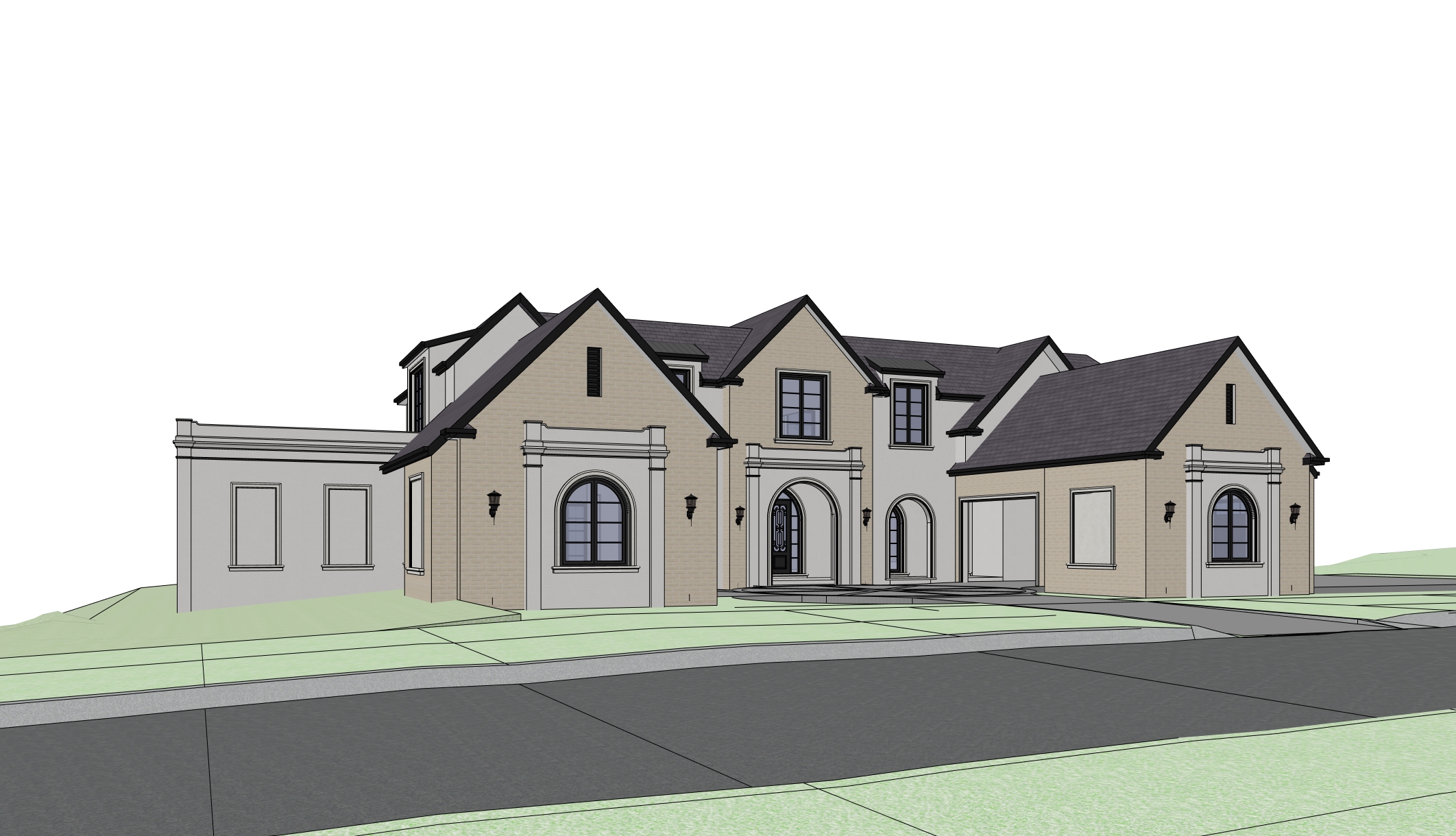a high end architectural visualization of french country style residence viewed from a street into a motor court and centred driveway port cocher on the right side no garage door on the right side no curtain to the ground level windows the composition emphasizes balance elegance and a formal landscaped setting style classic french country architecture with a refined minimalist interpretation photorealistic rendering with soft diffused natural lighting and a calm slightly desaturated tone for a sophisticated aesthetic colour palette main exterior warm off white limestone brick and smooth rendered stucco plaster with a matte finish roof soft dark grey slate with minimal tone variation window frames matte black doors wrought iron entry door with glass insert metal elements matte black lanterns hardware landscaping rich greens with structured hedges and soft planting paving light neutral stone and exposed aggregate aggregate concrete edge kerb material scheme exterior walls warm off white limestone brick and smooth rendered stucco plaster with a matte finish roof natural slate tiles with fine texture and minimal variation windows metal frames with clear glazing entry door wrought iron entry door with glass insert and satin finish pathways cut stone or limestone pavers with subtle joints landscape manicured hedges simple natural topiary shape and soft lawn lighting environment soft daylight late afternoon or dusk with gentle shadows with dramatic sky and reflections of the internal lighting slightly overcast or diffused sky for even lighting warm ambient bounce light to enhance material richness rendering details ultra realistic pbr materials with subtle imperfections eye level perspective balanced contrast for a timeless feel wet slate roofing wet road with reflections of the internal lighting