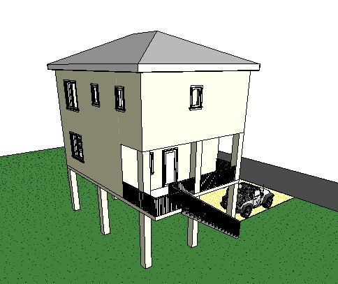 the roof is light color metal the walls of the home are a very pale yellow the facia and trim around windows is white the home is in a tropical setting there are coconut palms nearby the sky has puffy clouds