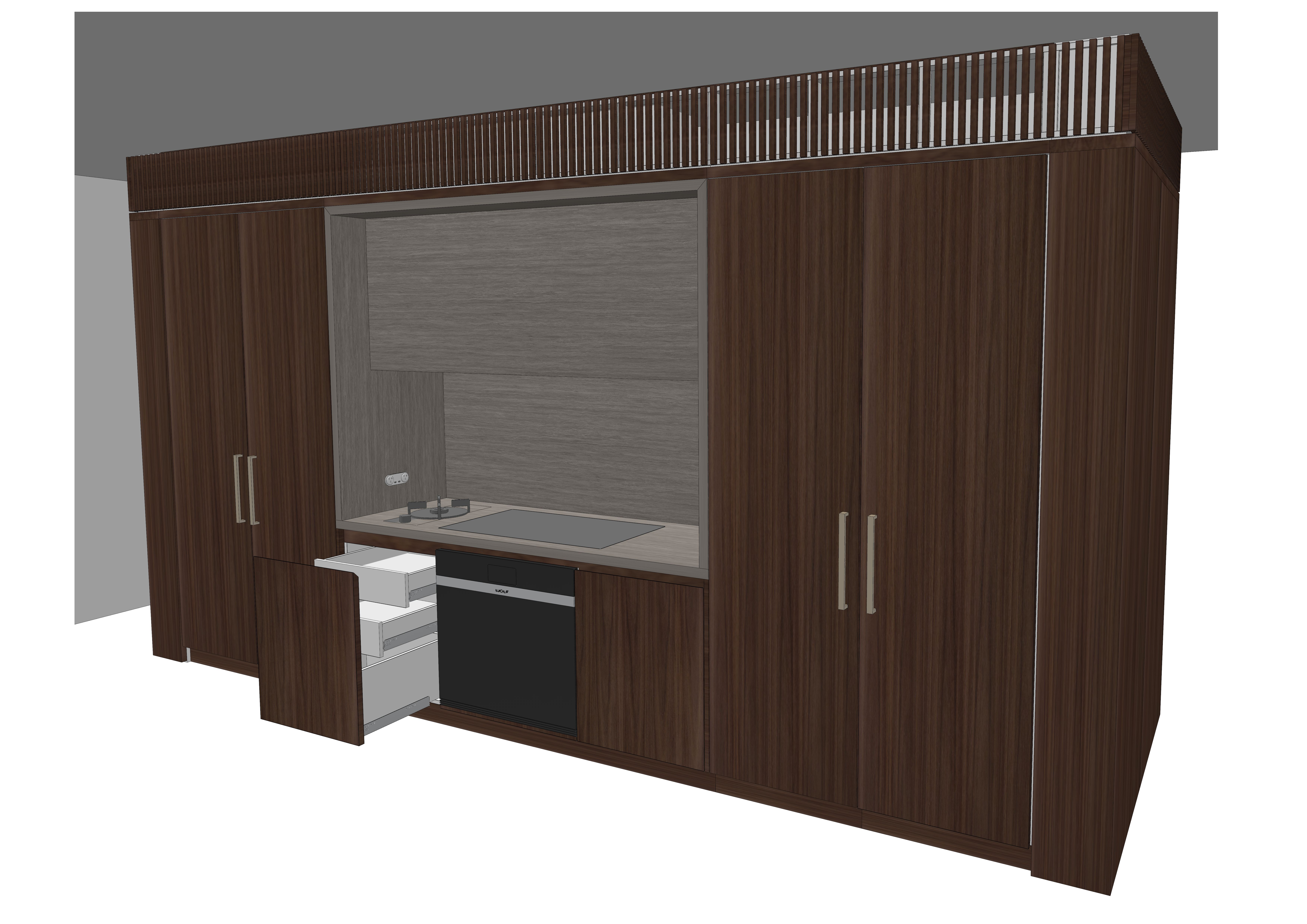 model geometry detailing explicit edge chamfers and bevels avoid razor sharp edges real world materials always have micro rounding consistent real world scale ensure all components are modelled to true dimensions mm preferred layered joinery logic include reveals shadow gaps and panel offsets to reflect actual fabrication methods sink and tap cutouts model these with tolerance gaps and under mount inset logic as per spec handle recesses or mounting plates if applicable show how handles are fixed surface mount vs integrated pull material metadata pbr texture maps include albedo roughness normal and specular maps for timber marble and brass grain direction tags annotate grain flow per panel to enforce grain matching logic reflectivity and gloss levels define per material e g satin brass low gloss polished marble high gloss vein pattern control for marble specify vein direction density and contrast level e g calacatta vs statuario lighting environment hdri environment map use a daylight interior hdri with soft shadows and neutral colour temperature 5000k light source tagging annotate window positions artificial light sources and bounce surfaces shadow softness define penumbra width to avoid harsh cg style shadows styling accessory logic accessory placement zones define styling zones on benchtops with bounding boxes or anchor points accessory material tags e g ceramic bowl linen towel matte soap dispenser clutter threshold specify max number of accessories per zone to preserve minimalist intent camera composition guidance preferred angles e g 35mm lens equivalent eye level or slightly above 3 4 perspective focal depth annotate key focal planes e g sink edge handle line to guide depth of field framing logic define crop boundaries to avoid cutting off key joinery or material transitions