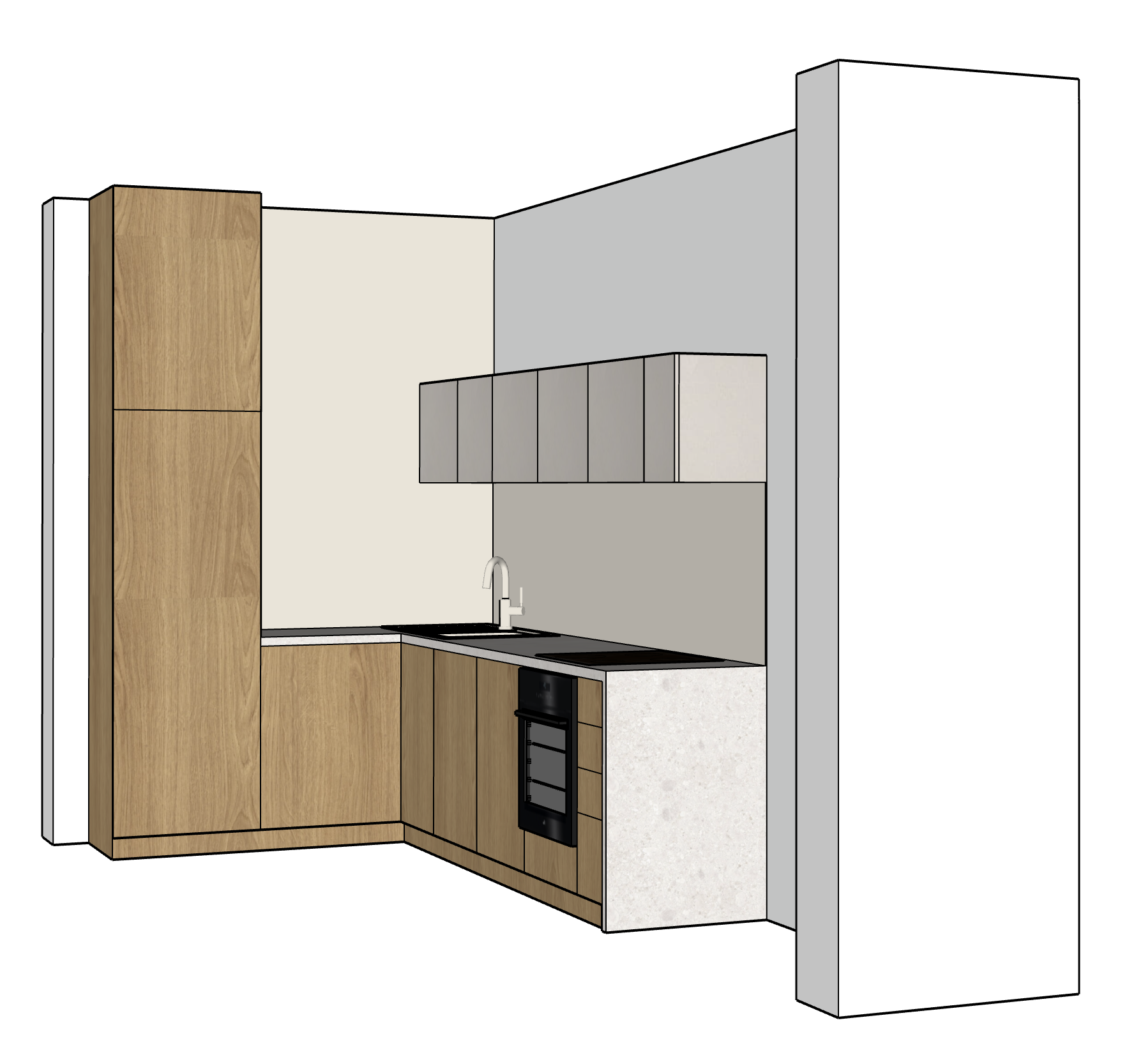 vrchne skrinky farba ka mir pod vrchn mi skrinkami osvetlenie led p s kuchynsk doska vo farbe svetl kame ikea saljan vodovodn bateria vo farbe beige drez vo farbe beige s odkvapovou plochou smerom ku stene vstavan rura cel cierna leskla stena pod a ved a skriniek svetl beige mikrocement