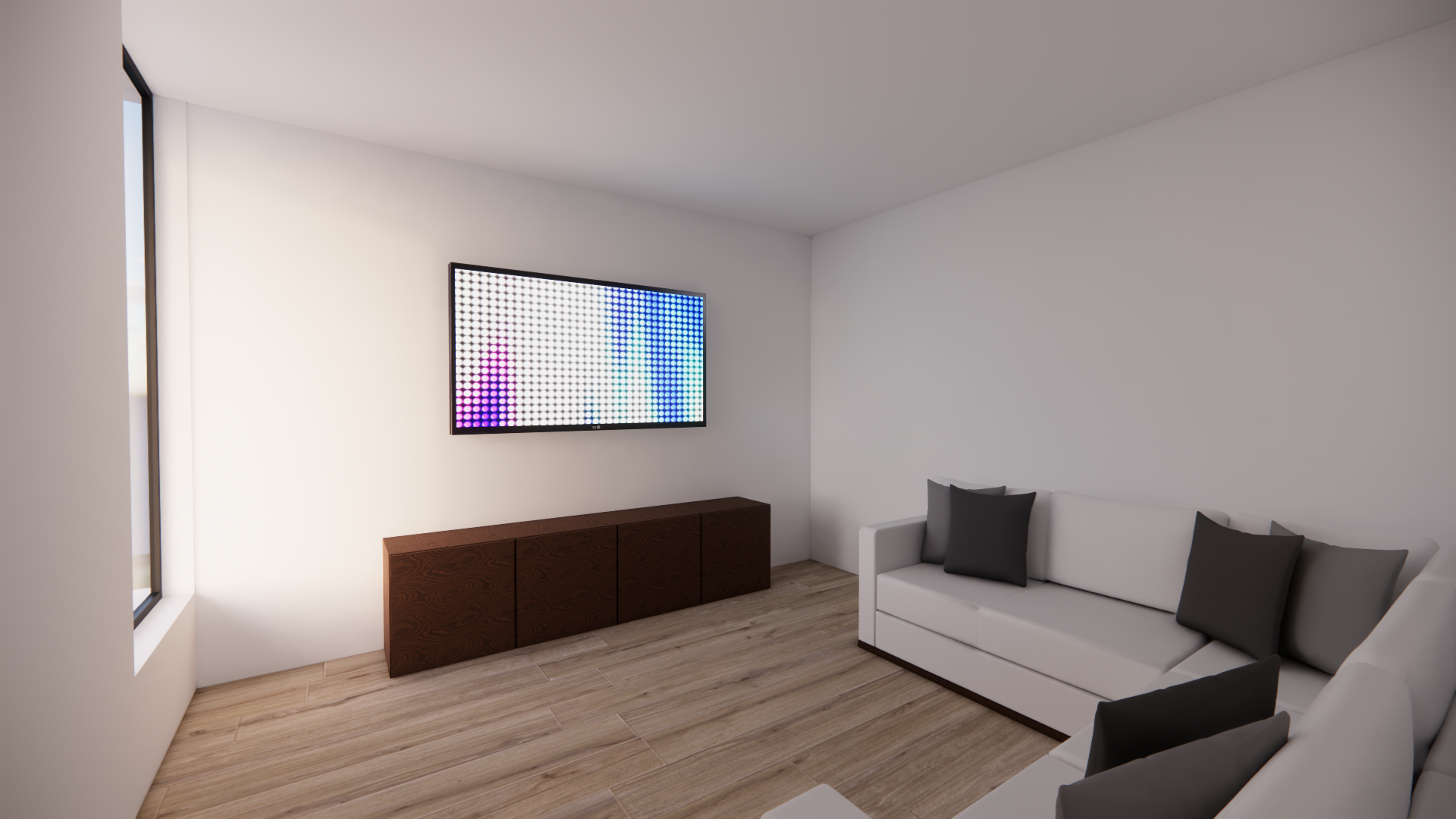 add nice modern decoration on cabinet under tv add appropriate lighting at the ceiling add nice throw blankets on the couch add nice warm glowy accent lighting around tv