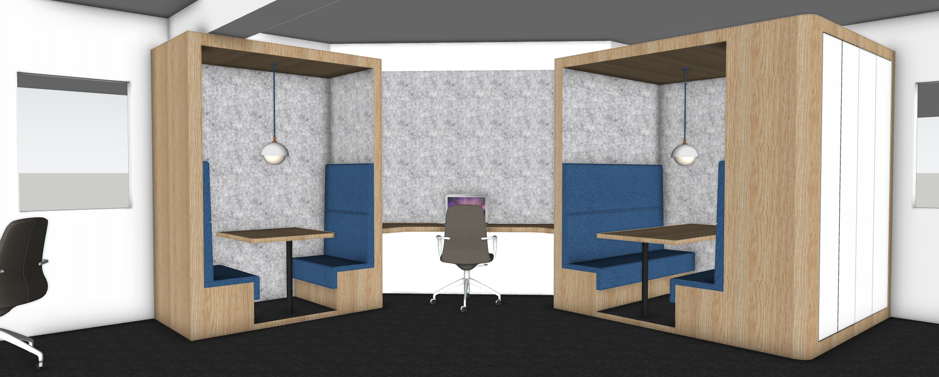 white plaster ceiling and small recessed downlights subtle glow in pendants in booth students sitting in booth and chairs white bessa block walls