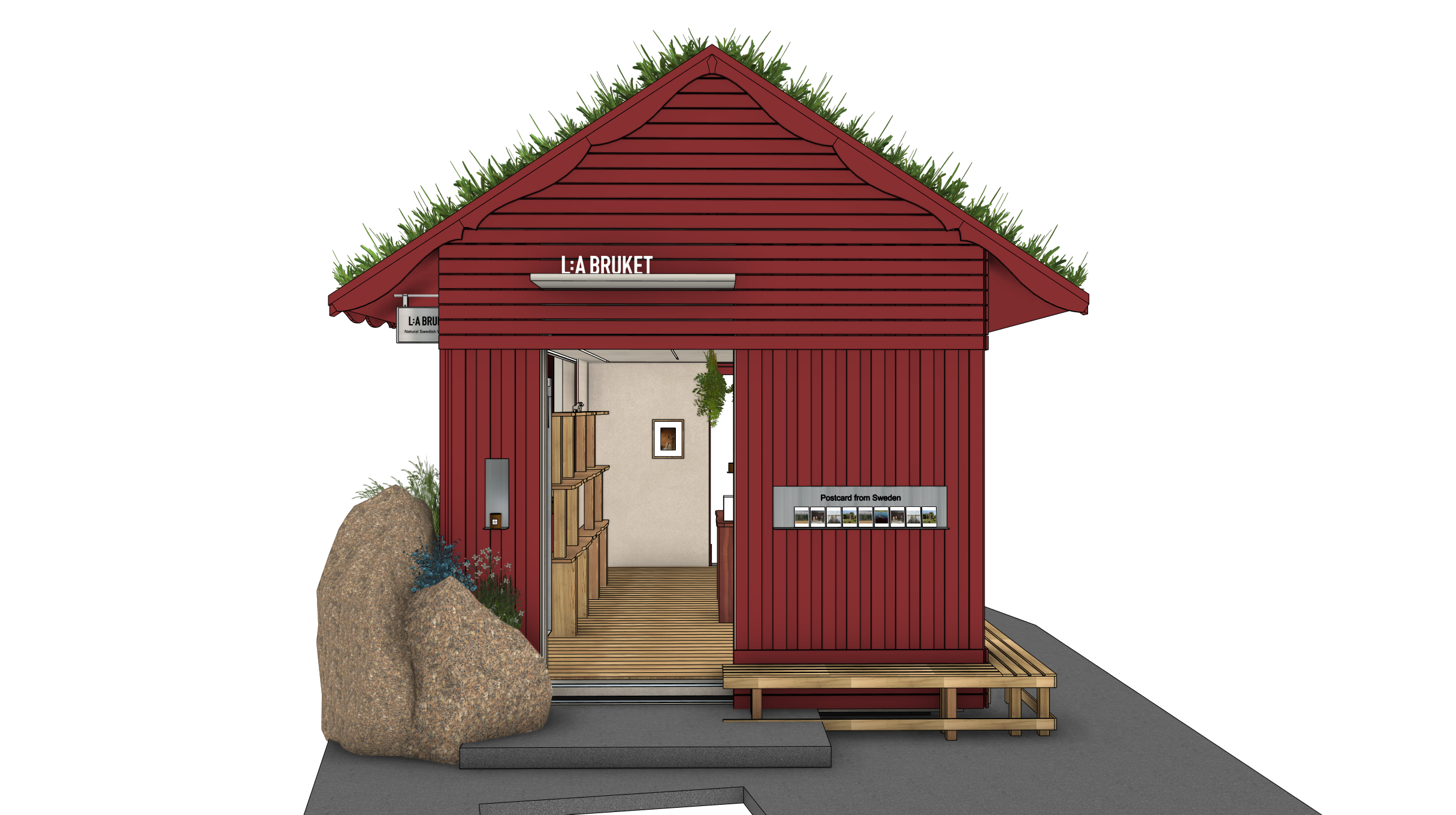 constraints preserve original geometry exactly no changes to form proportions or openings maintain original camera perspective environment dusk scene with pools of steet lights bright enough to expose all the textures in the scene urban context concrete pavement ground plane surrounding buildings modern architecture with concrete fa ades blurry skyscrapers enviroment should look secondary to the red house roof the most important on the roof add natural high wild grass and little bit of small wild flowers it must look super realistic materials details main fa ade change red colour surface into falu red painted timber planks cladding visible photo realistic wood pattern windows add reflective glazing roof natural green vegetation with wild herbs and flowers stones create natural looking brown shades of granite rough texture vegetation exchange the plants with realistic looking wild grass and herbs dont change their position only make it more realistic slightly unstructured organic growth contrasting with urban setting background include urban trees typical for a city environment lighting rendering add soft glowing light in the window moody nighlight realistic shadows global illumination high detail physically accurate materials balanced contrast cinematic warm tone