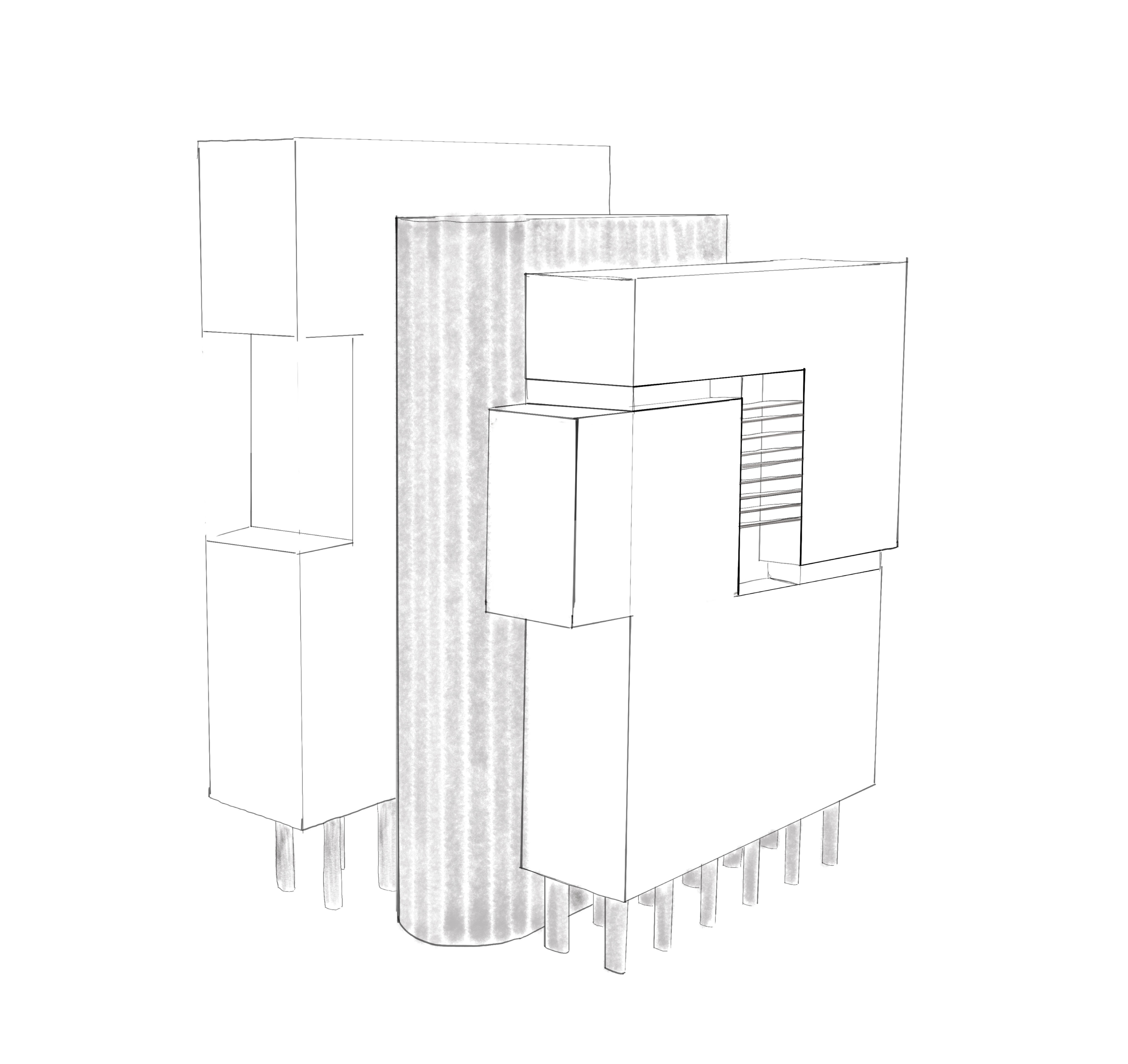 brutalism exterior shot make sure middle structure has concrete facade front and back structures have terra cotta skin tower has 30 levels architecture