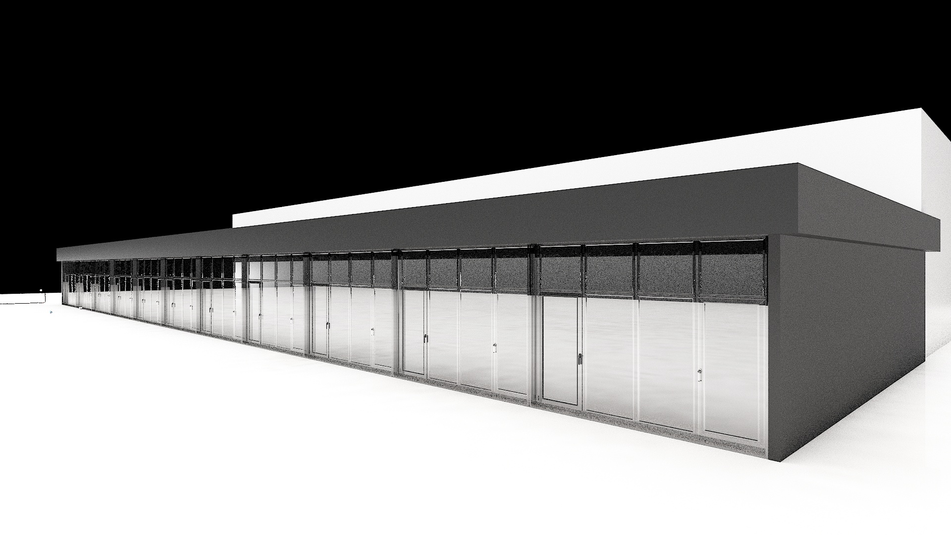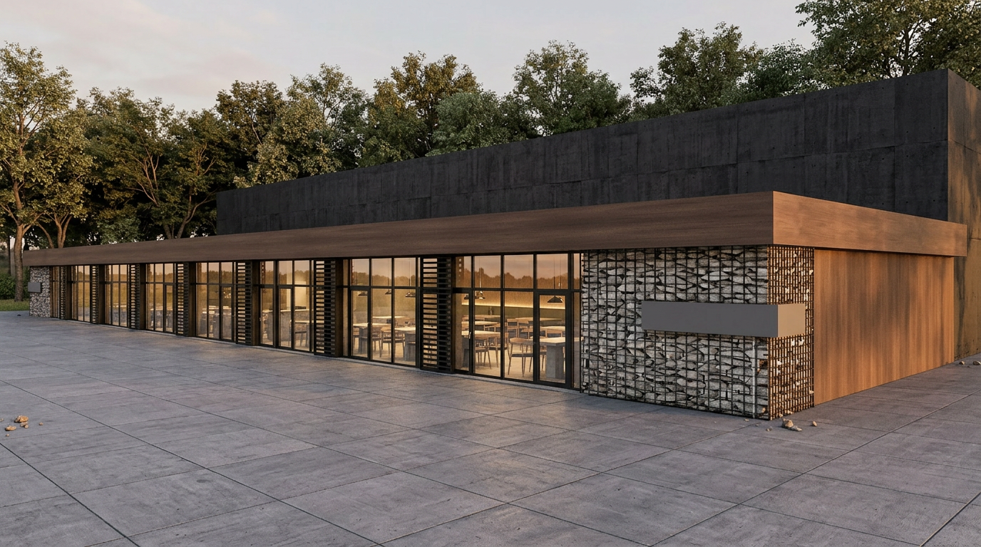 create hyper realistic and sofisticated facade rendering with expose concrete in black large glass minimalist windows and put all the wooden elements int the picture in an inconspicuous wood decor make the tilles in front of building realistic gray concrete the lightening is soft and golden with soft shadows and realistic reflections stone on the facade with black metal mesh to present realistically as a detail that fits into the modern facade make the background so that the building is located in an open space with many realistic trees inside the building is a modern minimalist restaurant do not change anything on the facades