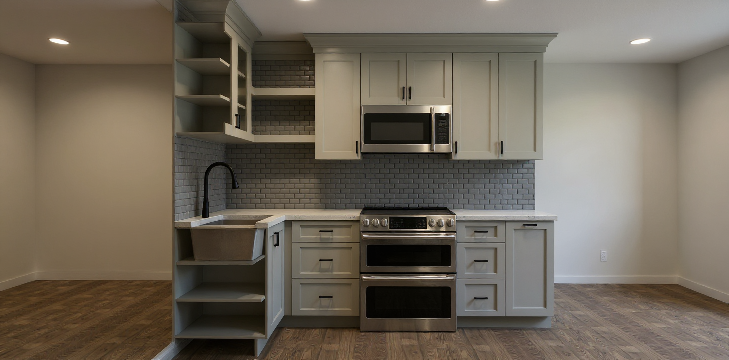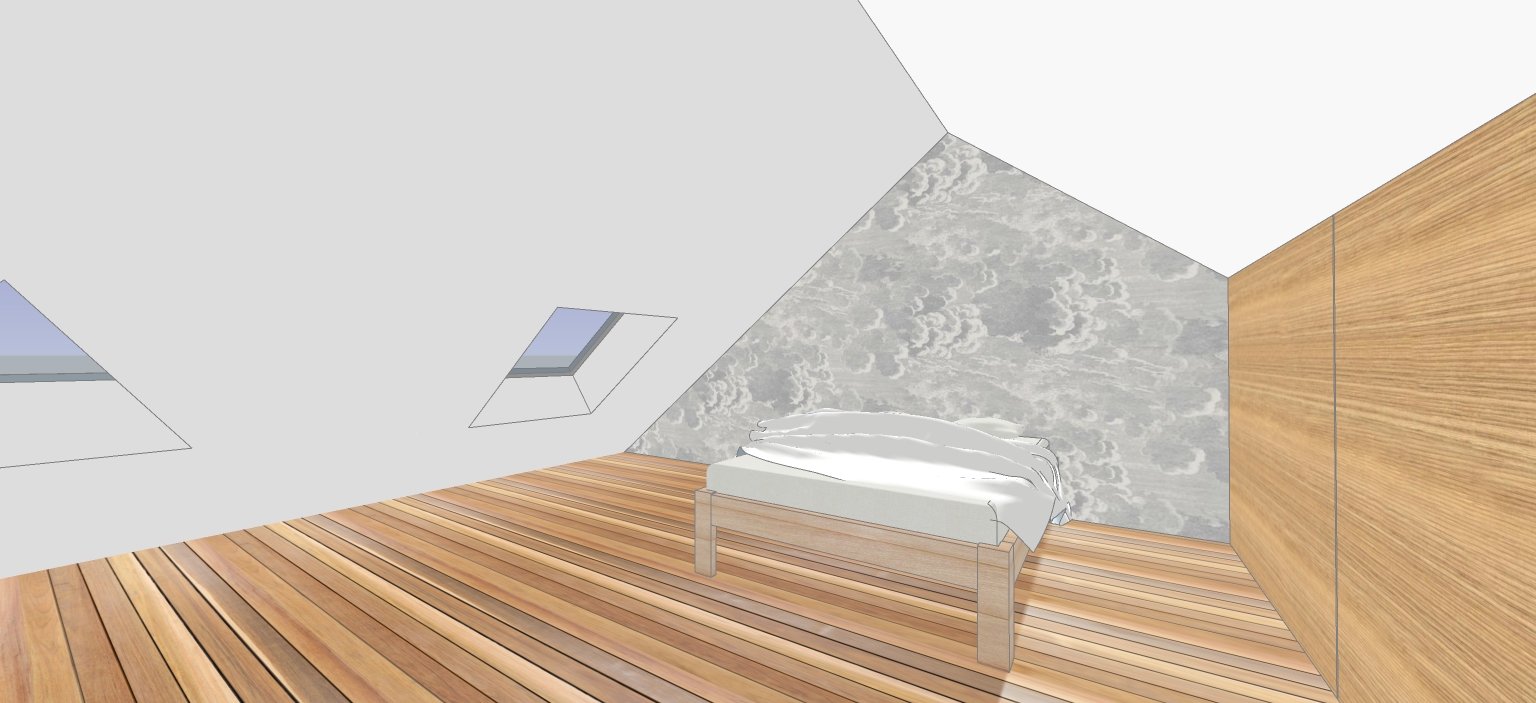 create a cozy minimalist bedroom with a serene atmosphere use soft white walls and a natural wooden floor in warm light brown tones the wall behind the bed features an elegant gray abstract cloud pattern wallpaper the bed has a simple wooden frame and is covered in crisp white linens a large window on the left provides a view of a sunny lush green landscape add two pendant lights above the headboard with soft warm light to enhance the tranquil setting
