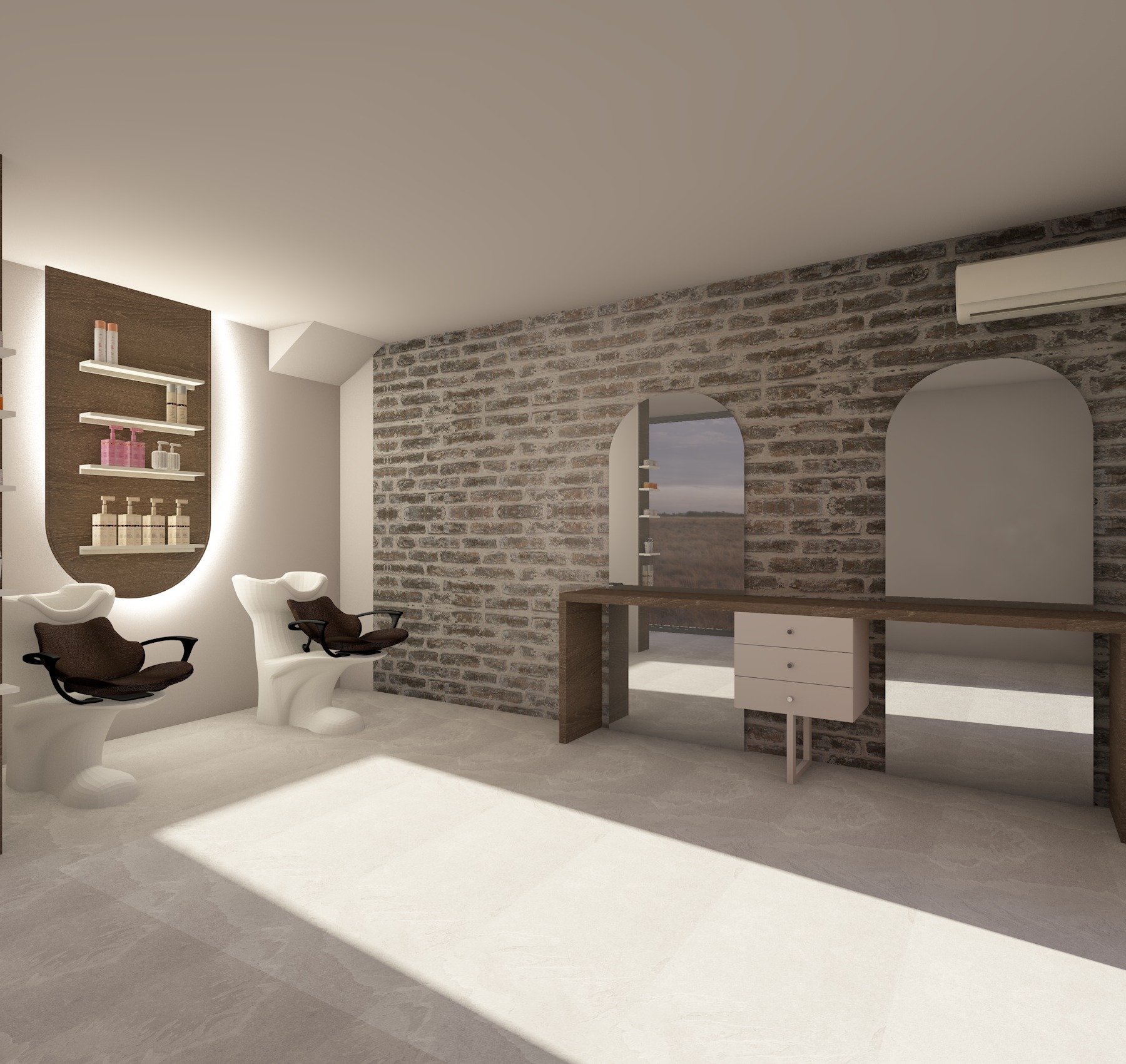 create a high realistic render of a luxury hair saloon the mirror area is designed as a calm atmospheric focal point within the salon each mirror is framed with integrated perimeter led lighting creating a soft diffused halo effect that enhances the sense of clarity and freshness in the space the mirror surface itself is intentionally treated to produce a subtle blurred reflection rather than a sharp image this diffused effect transforms the mirror from a purely functional element into a more artistic and abstract feature reducing visual intensity and contributing to a more relaxing user experience overall the space conveys a feeling of serenity softness and freshness promoting a sense of calm and understated luxury