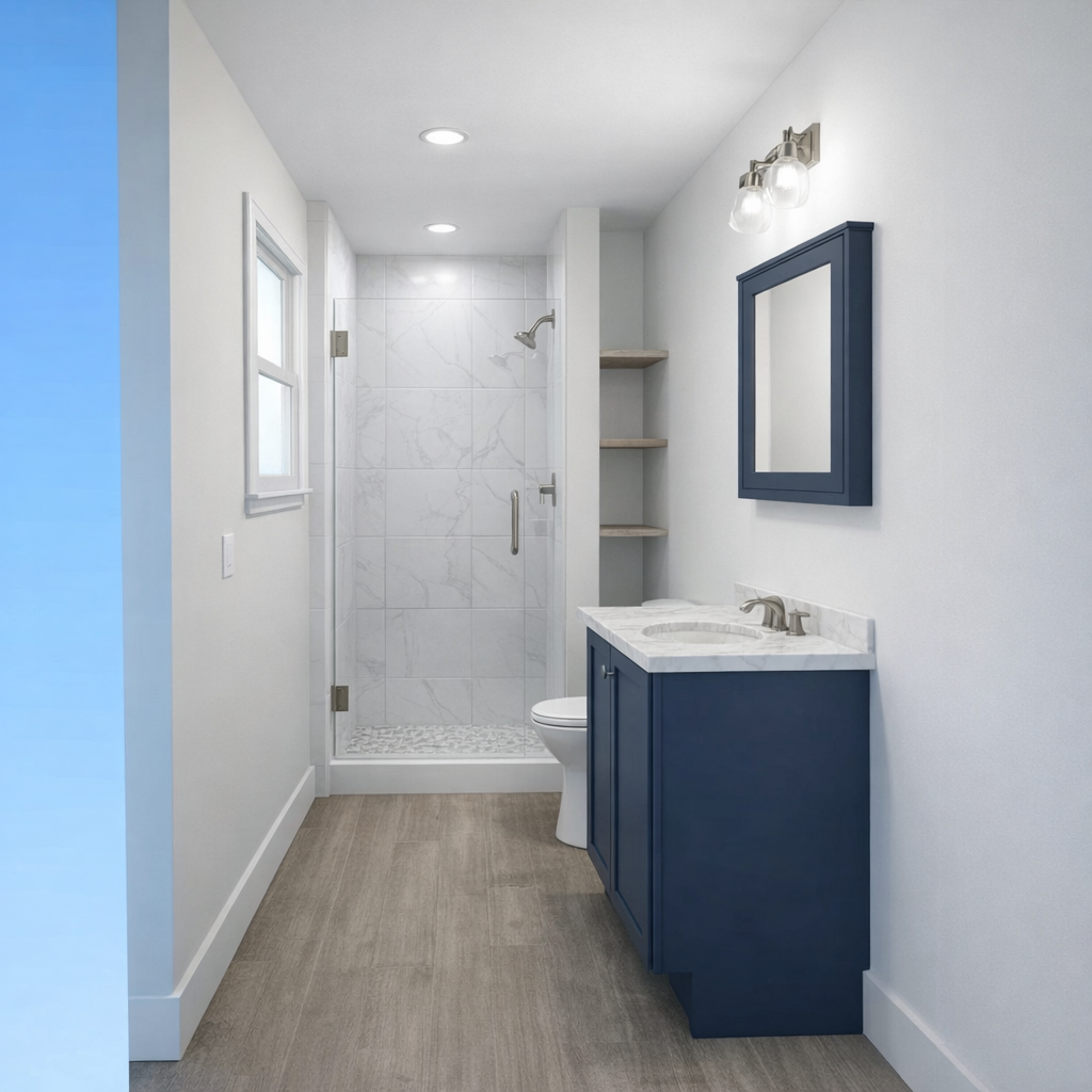 edit this bathroom photo by replacing the white walls with this paint color called misty by sherwin williams