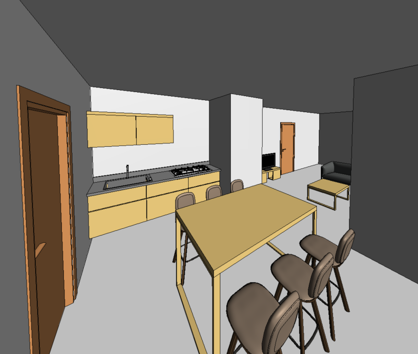 modernist interior shot a cozy interior view of a modern kitchen with a small breakfast bar and an adjoining living room at the back there is a large window letting in natural light the space is fully decorated and furnished with warm ambient lighting elegant hanging lamps and stylish decor elements the floor is wooden parquet duela giving a natural and welcoming feeling the design should feel realistic inviting and harmonious with attention to textures materials and atmosphere a modern interior ceiling design with a recessed cove cajillo for indirect lighting the cove lighting runs along the perimeter of the ceiling using warm led strips that create a soft and cozy glow the light should highlight the architectural details of the ceiling and enhance the overall ambient atmosphere of the room giving a contemporary yet welcoming look architecture