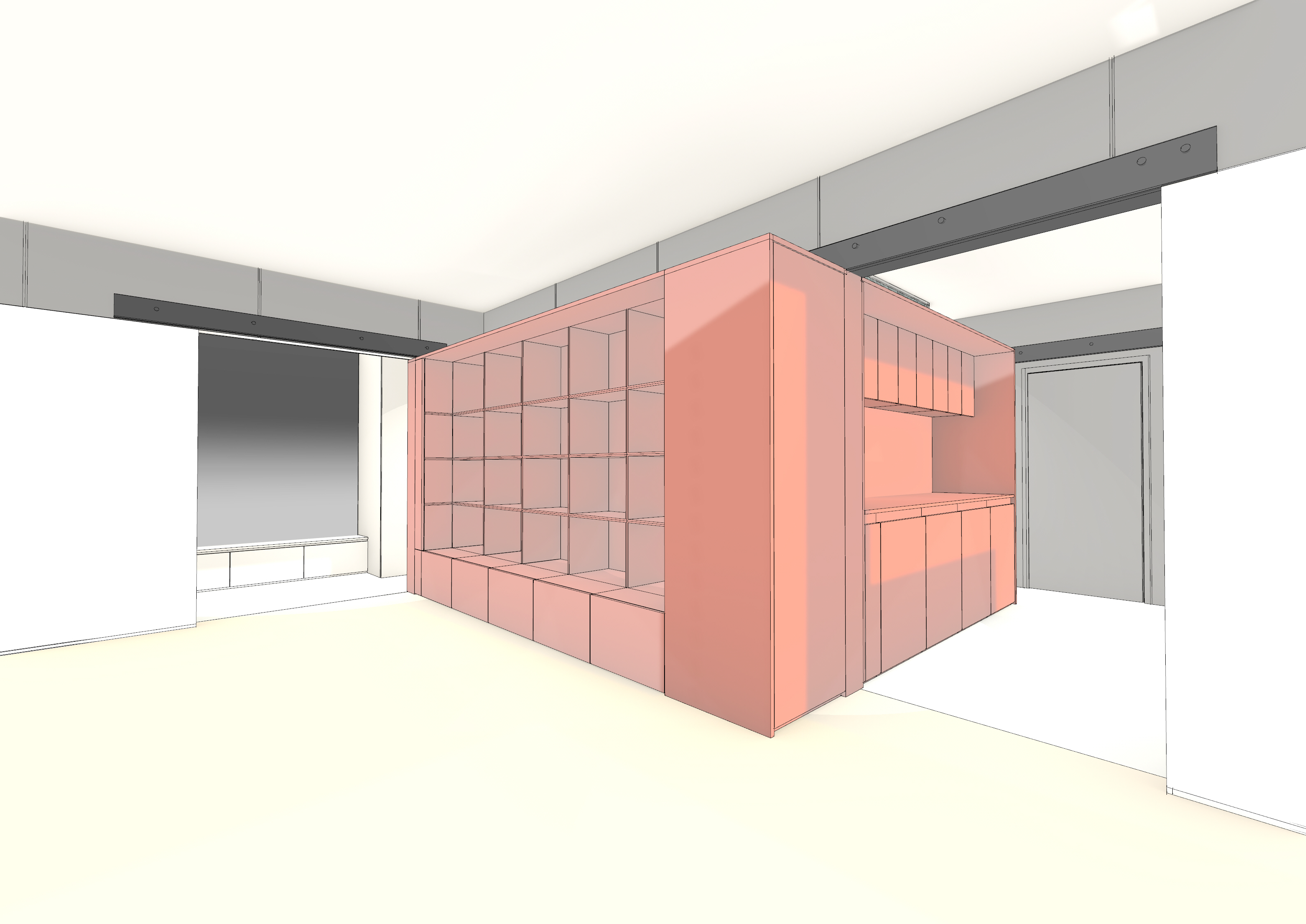 a living room and kitchen wardrobe box old deaturated terracotta finish material of central box carpentery wooden planks flooring french sample oak light concrete parts of panel walls with rought design of iron beams rest of ceiling and walls white plaster sunrise mood morning lighting