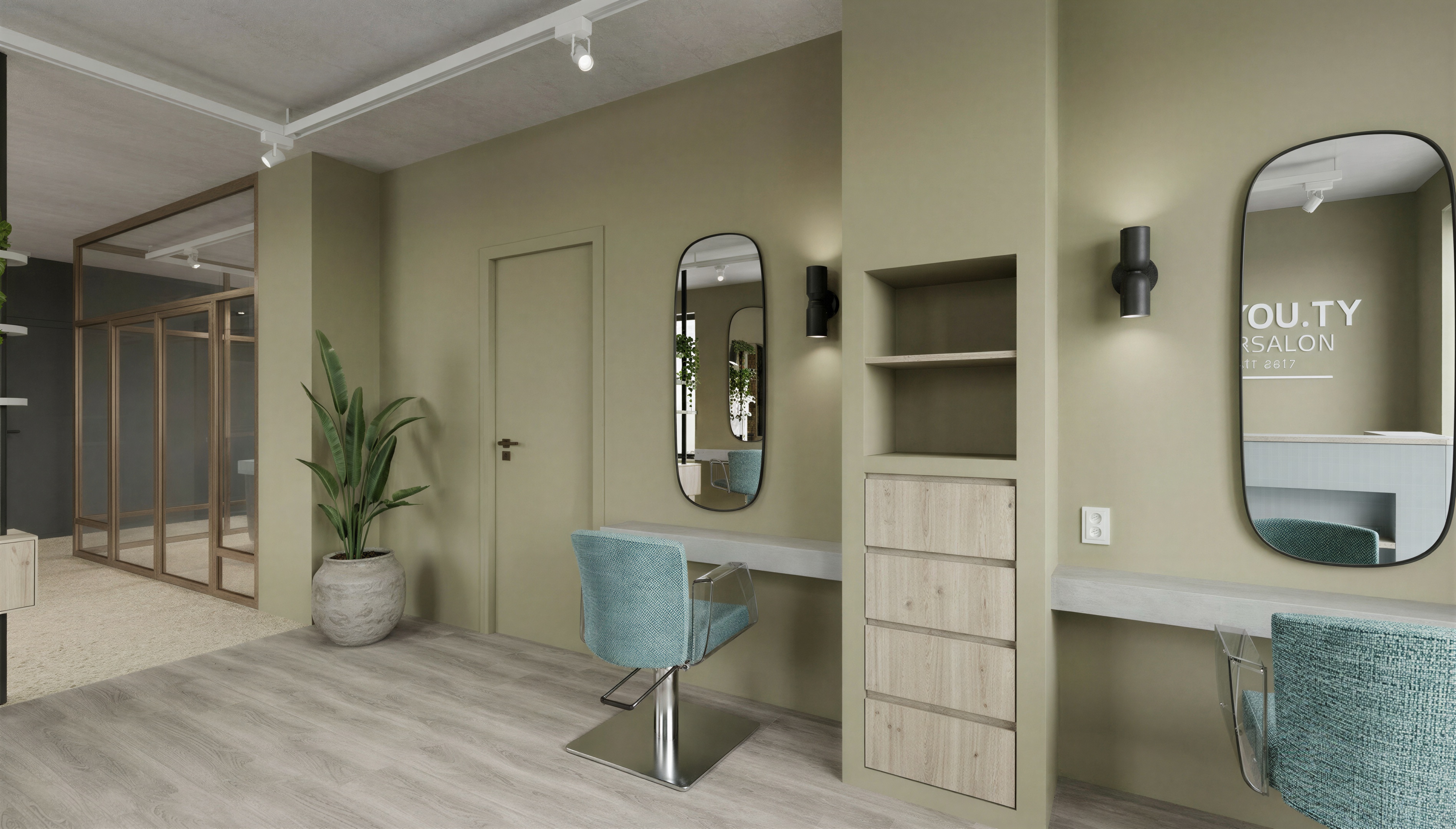 a precise edit of image 0 png where the central oval mirror above the left console has been restored to remove any view of an external window this mirror now reflects only the interior details of the salon directly opposite it specifically it should show the olive green wall a portion of the opposite built in light wood shelf unit and perhaps a small detail of a light fixture or the very edge of the other right side chair and console all consistent with the perspective all other elements from image 0 png must remain identical the olive green walls the wood floor the track lighting the left potted plant the left teal chair the console shelf the door the right side vanity with its text mirror you ty beauty salon est 2017 and chair the wall sconces the glass partition with its wood frame and the power outlet the overall lighting and color palette must be preserved the central reflection in the left mirror is now clean and purely interior