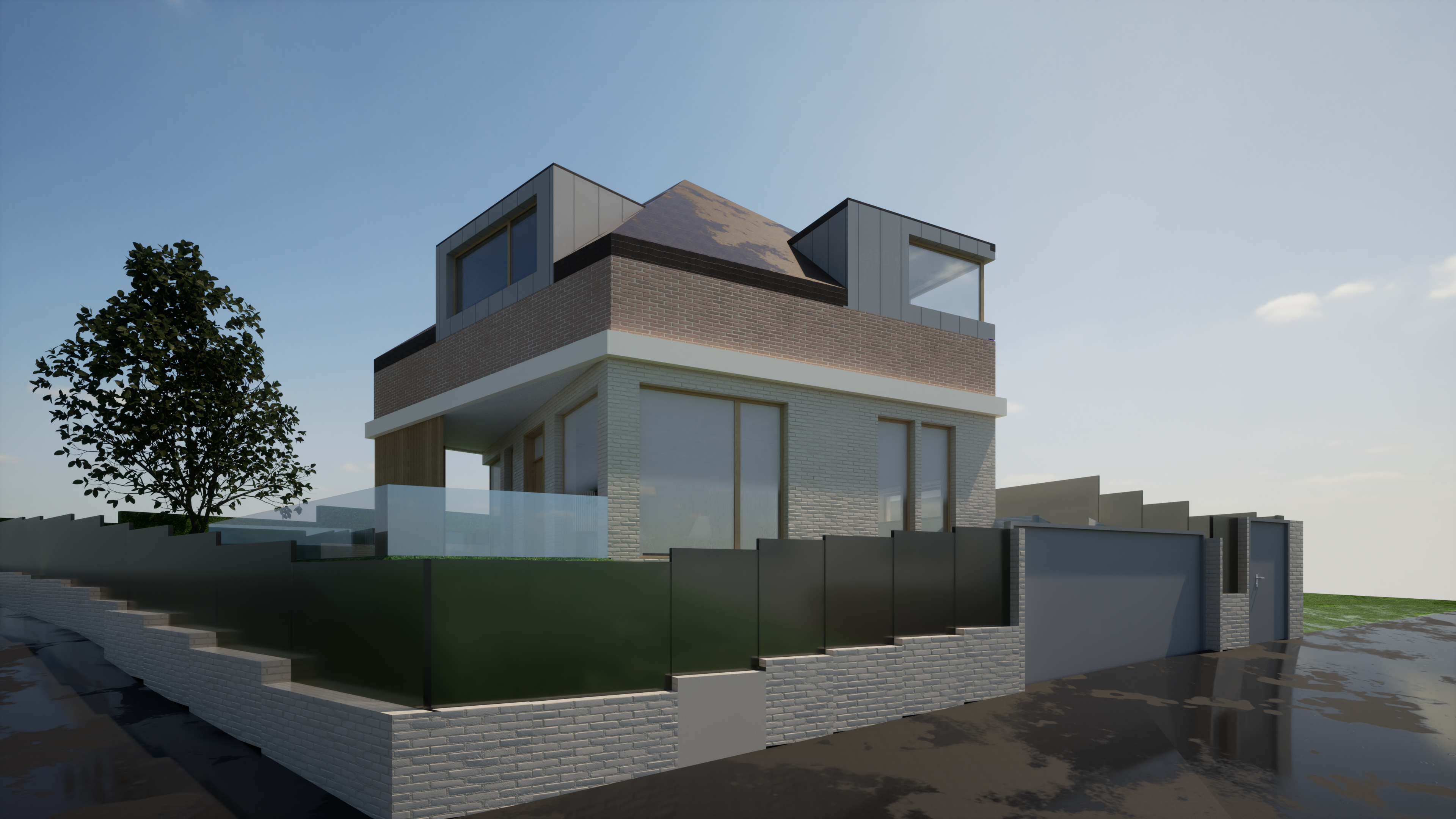 exterior shot modern two story house with a sleek contemporary design the structure features a combination of white bricks and clay brick walls with large windows framed in light coloured wood texture the upper section of the building is highlighted with smooth wooden panels in a warm oak finish adding a natural contrast surrounding the house there is a transparent glass railing contributing to the modern aesthetic a lush deep green hedge runs alongside the perimeter enhancing the natural ambiance overhead a clear blue sky with soft white clouds creates a calm and serene atmosphere highlighting the house s sharp lines and minimalist elegance kepp the texures and shapes but make everything look more realistic